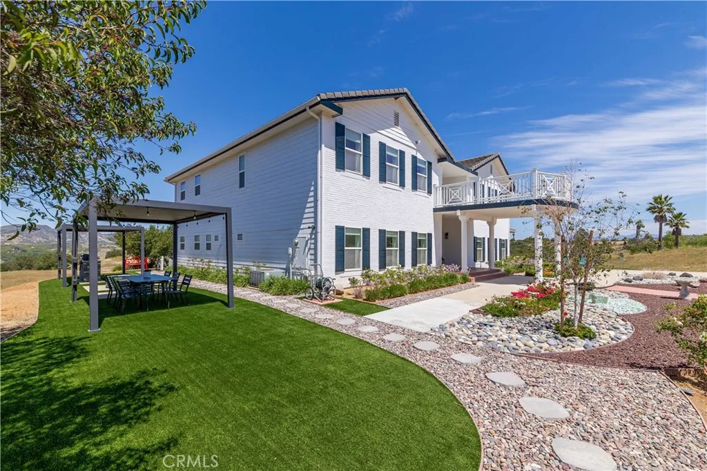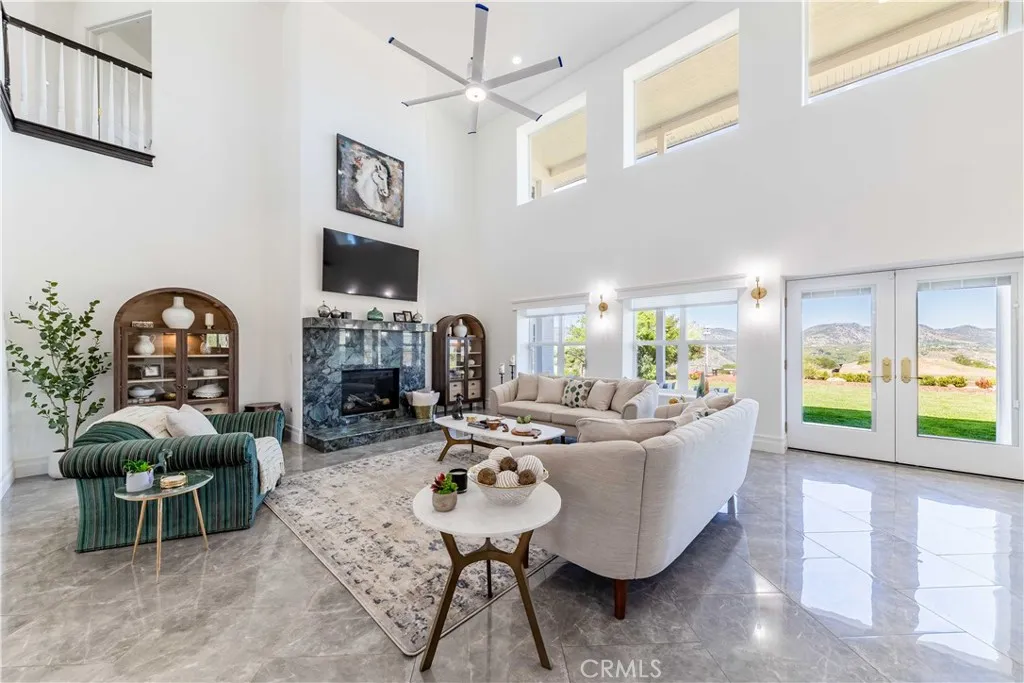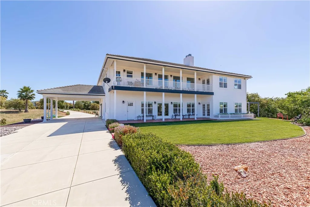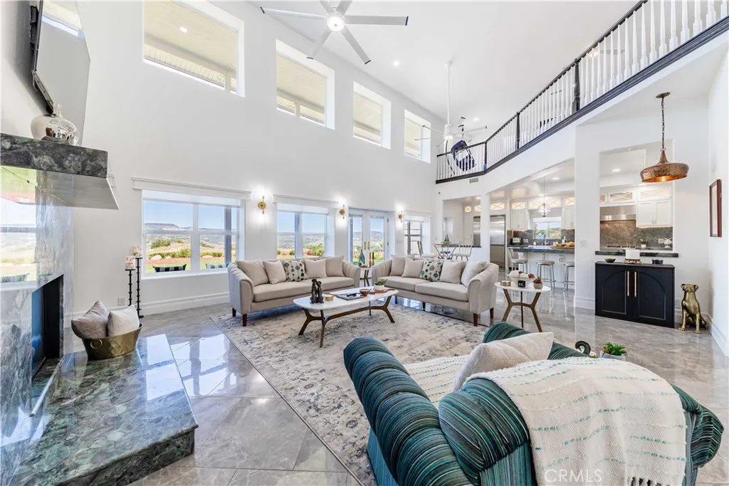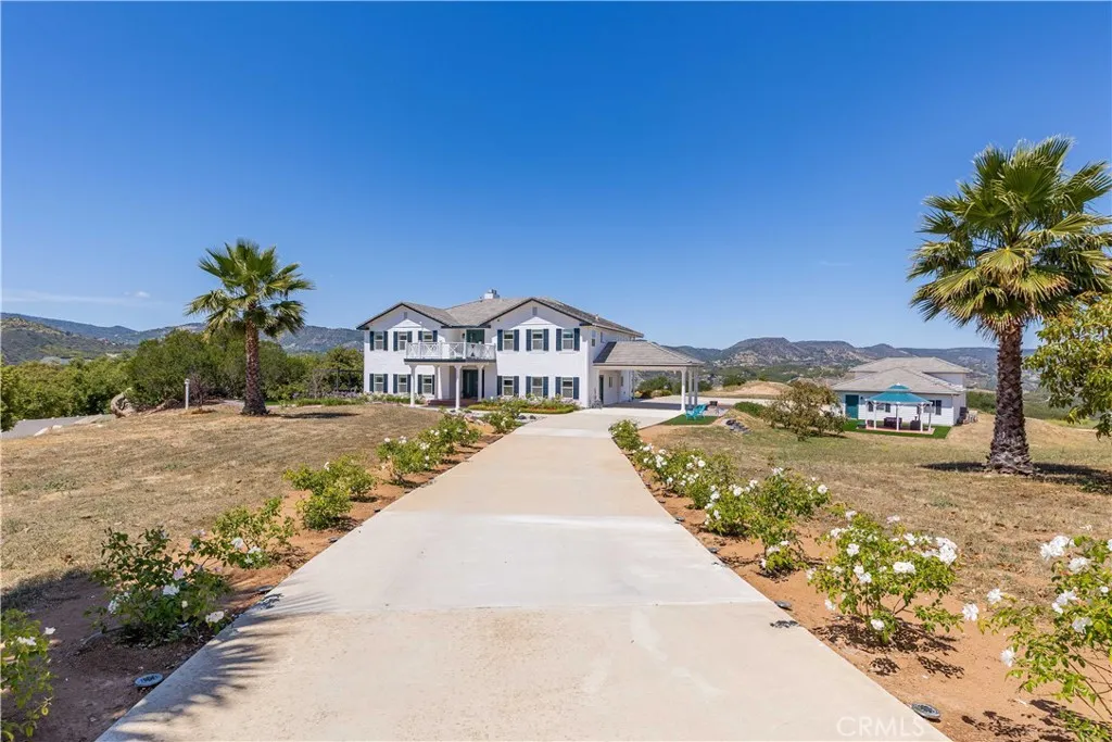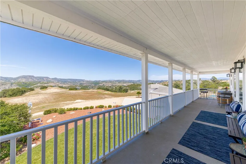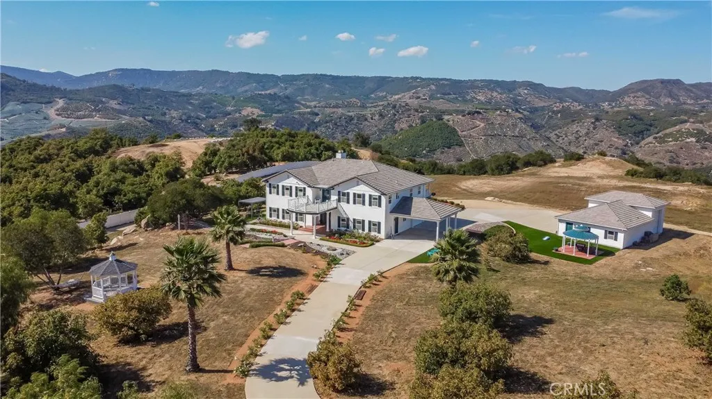 Perched atop a private hilltop in the prestigious De Luz hills, this extraordinary estate offers over 25 acres of breathtaking, panoramic views, unmatched privacy, and a lifestyle defined by tranquility and natural beauty. From the moment you arrive through one of three gated entrances, a picturesque, rose-lined driveway framed by mature avocado and palm trees sets the tone for what lies ahead. Constructed with energy-efficient eco-block construction, this residence offers superior insulation, durability, and year-round comfort—enhanced by the area’s signature ocean cooled breeze that gently flows across the property. Inside, soaring 20-foot ceilings and expansive windows flood the home with natural light while capturing stunning views from virtually every room. The thoughtfully designed floor plan features 4 bedrooms and 4 bathrooms, including a luxurious downstairs primary suite with dual vanities, soaking tub, dual-head shower, and custom walk-in closets. A secondary upstairs suite, large loft, and multiple view decks provide flexible living and entertaining spaces. At the heart of the home, the gourmet kitchen is equipped with premium Viking appliances, including a six-burner range, built-in refrigerator, microwave, hood, and additional KitchenAid upgrades. Quartzite countertops, a large center island with custom wine storage, walk-in pantry, and abundant cabinetry make this space as functional as it is beautiful. Seamless indoor-outdoor living is highlighted by multiple entertaining areas, including expansive balconies, pergolas, gazebos, BBQ area, and manicured turf spaces. The grounds offer exceptional usability with room for equestrian use, agriculture, or future enhancements such as a pool or guest expansion. A detached garage with RV access and full bath adds versatility. Additional highlights include polished porcelain tile flooring, designer gold-accented fixtures, two gas fireplaces, a custom mudroom with full bath, and a built-in under-stair pet retreat. The property features multiple fruit trees, mature avocado production potential, extensive hardscape with stone walkways, and low-maintenance landscaping. Concrete siding enhances durability, while abundant storage and thoughtful built-ins add everyday functionality. This rare offering combines luxury, land, and lifestyle—just minutes from Old Town Temecula and Temecula Wine Country—creating a truly one-of-a-kind opportunity in one of Southern California’s most coveted rural communities.
