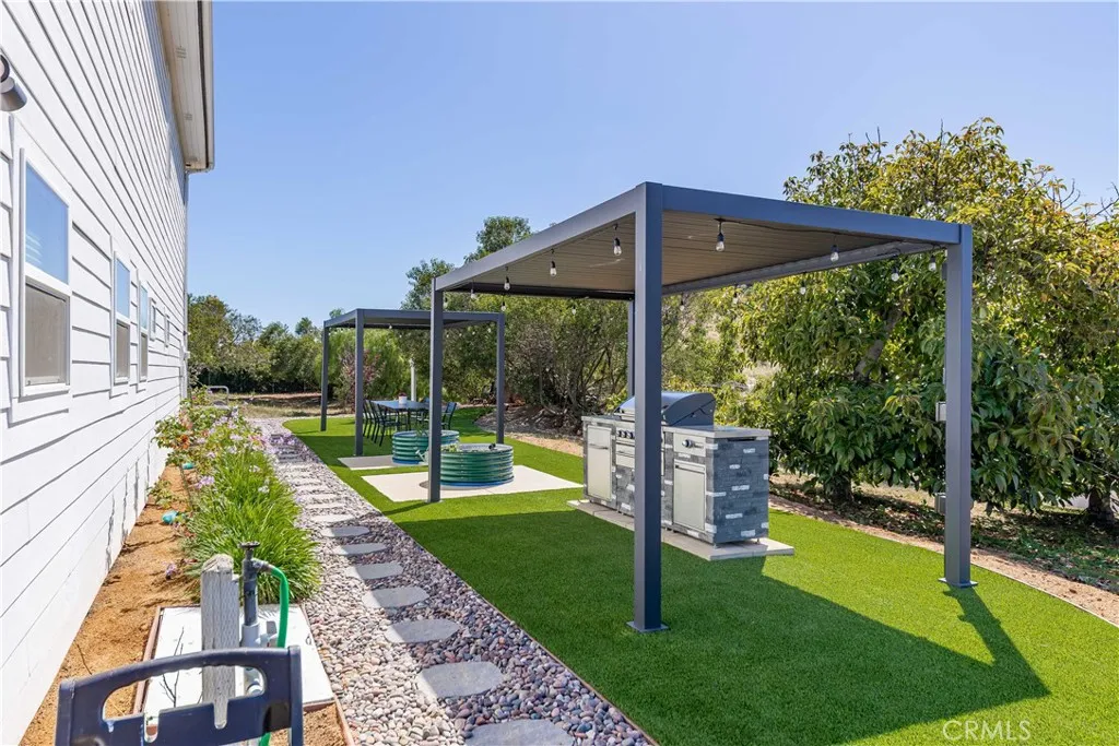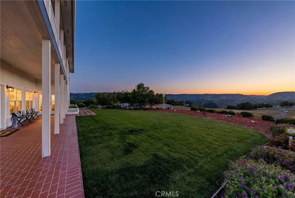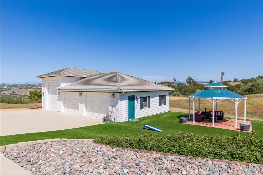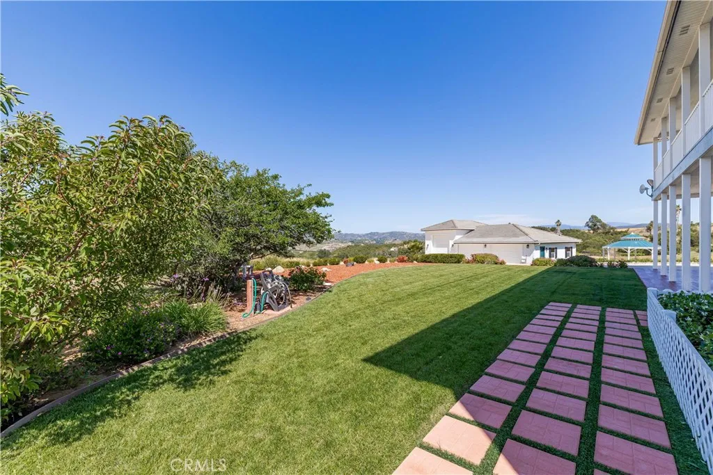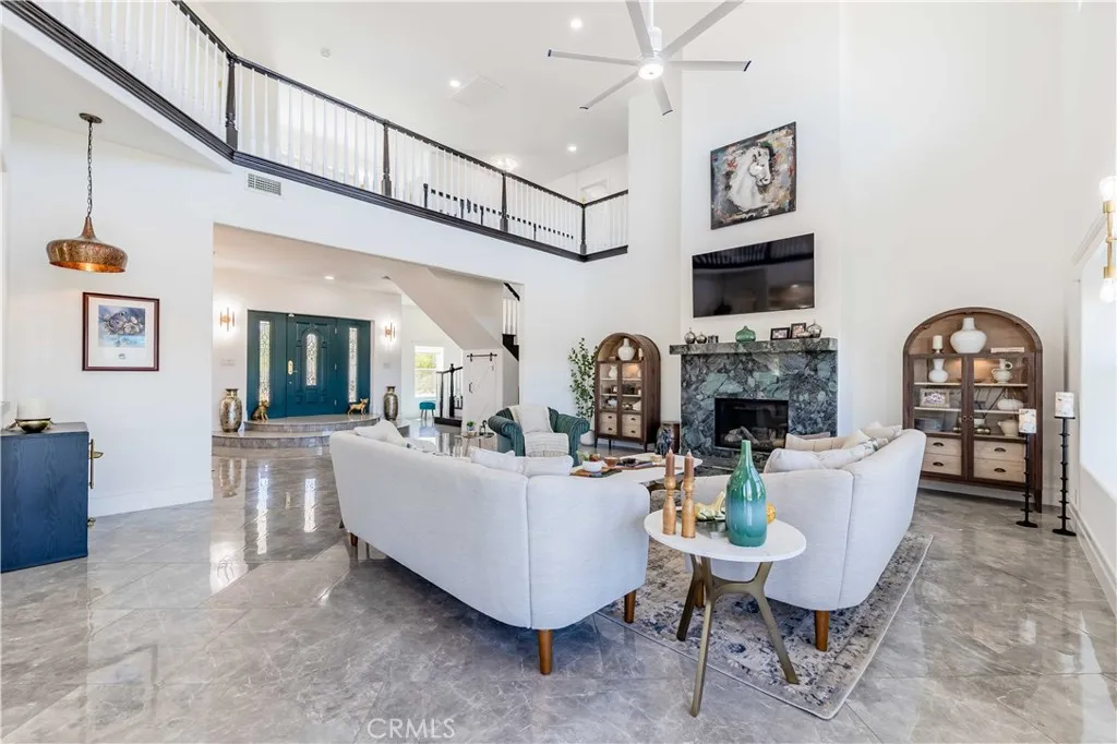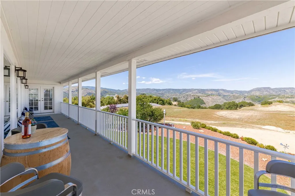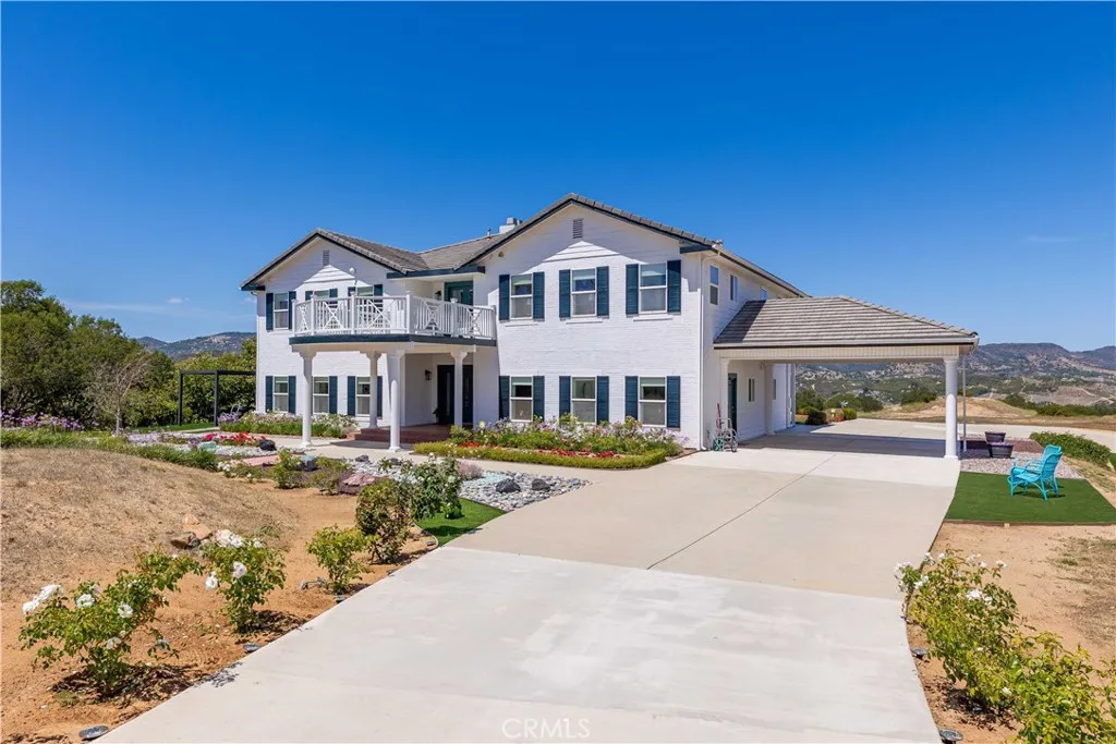 Perched atop a private hilltop in the prestigious De Luz hills, this extraordinary estate offers over 25 acres of breathtaking, panoramic views, unmatched privacy, and a lifestyle defined by tranquility and natural beauty. From the moment you arrive through one of three gated entrances, a picturesque, rose-lined driveway framed by mature avocado and palm trees sets the tone for what lies ahead. Constructed with energy-efficient eco-block construction, this residence offers superior insulation, durability, and year-round comfort—enhanced by the area’s signature ocean cooled breeze that gently flows across the property. Inside, soaring 20-foot ceilings and expansive windows flood the home with natural light while capturing stunning views from virtually every room. The thoughtfully designed floor plan features 4 bedrooms and 4 bathrooms, including a luxurious downstairs primary suite with dual vanities, soaking tub, dual-head shower, and custom walk-in closets. A secondary upstairs suite, large loft, and multiple view decks provide flexible living and entertaining spaces. At the heart of the home, the gourmet kitchen is equipped with premium Viking appliances, including a six-burner range, built-in refrigerator, microwave, hood, and additional KitchenAid upgrades. Quartzite countertops, a large center island with custom wine storage, walk-in pantry, and abundant cabinetry make this space as functional as it is beautiful. Seamless indoor-outdoor living is highlighted by multiple entertaining areas, including expansive balconies, pergolas, gazebos, BBQ area, and manicured turf spaces. The grounds offer exceptional usability with room for equestrian use, agriculture, or future enhancements such as a pool or guest expansion. A detached garage with RV access and full bath adds versatility. Additional highlights include polished porcelain tile flooring, designer gold-accented fixtures, two gas fireplaces, a custom mudroom with full bath, and a built-in under-stair pet retreat. The property features multiple fruit trees, mature avocado production potential, extensive hardscape with stone walkways, and low-maintenance landscaping. Concrete siding enhances durability, while abundant storage and thoughtful built-ins add everyday functionality. This rare offering combines luxury, land, and lifestyle—just minutes from Old Town Temecula and Temecula Wine Country—creating a truly one-of-a-kind opportunity in one of Southern California’s most coveted rural communities.