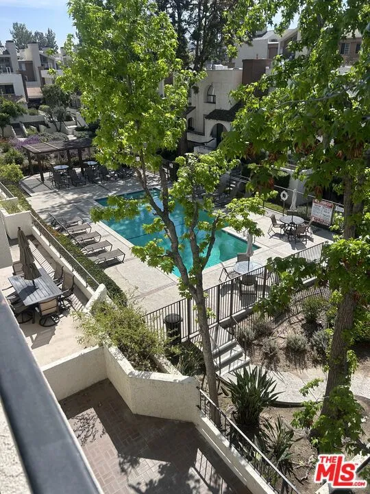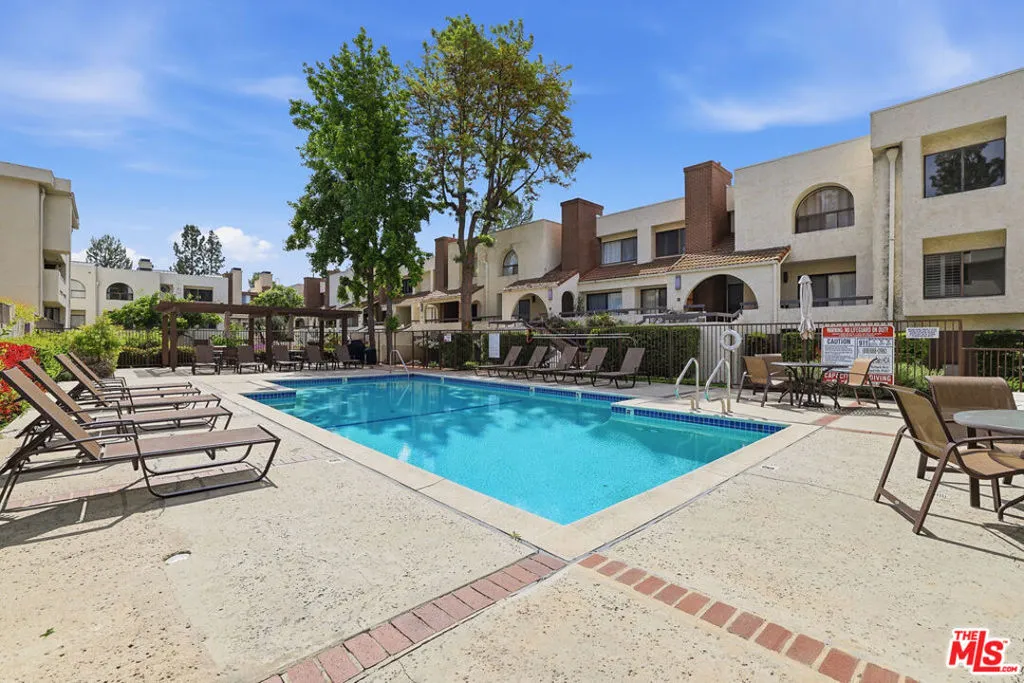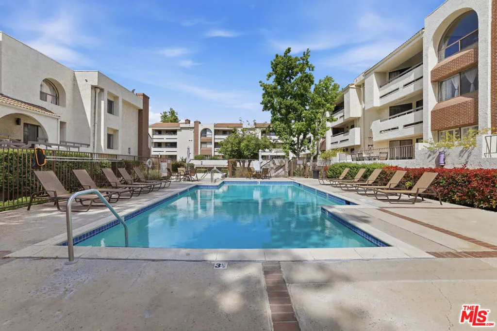 Welcome to this Beautiful One Level Condo in the Heart of Woodland Hills. New Flooring and New Paint throughout. Beautiful Large Arched Window overlooking the grounds and pool. This Unit is a wonderful unit to live in or as a rental. Kitchen with a breakfast Bar. Two Good size bedrooms with high ceilings and walk in closet. Laundry in the unit. Central Air and Heat. The building is secured and is well maintained with strong reserves. The Building also includes a pool, spa, fitness center, and Guest parking. Monthly HOA payment includes water, trash & earthquake insurance. Walking distance to Topanga Mall, Parks, Ventura Blvd. Really Wonderful unit and building.