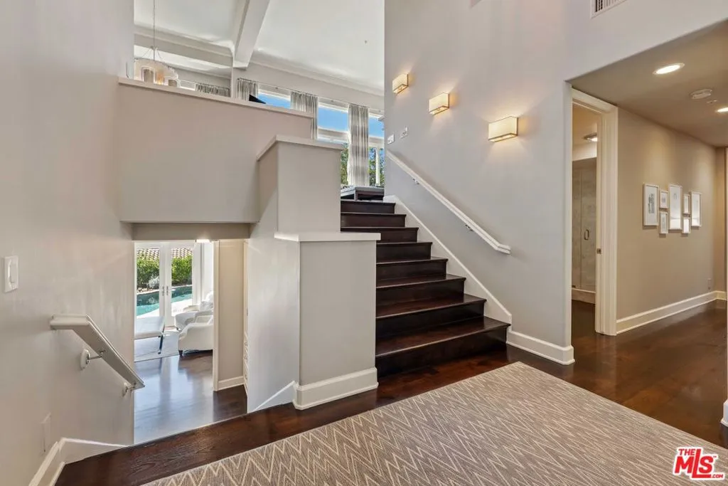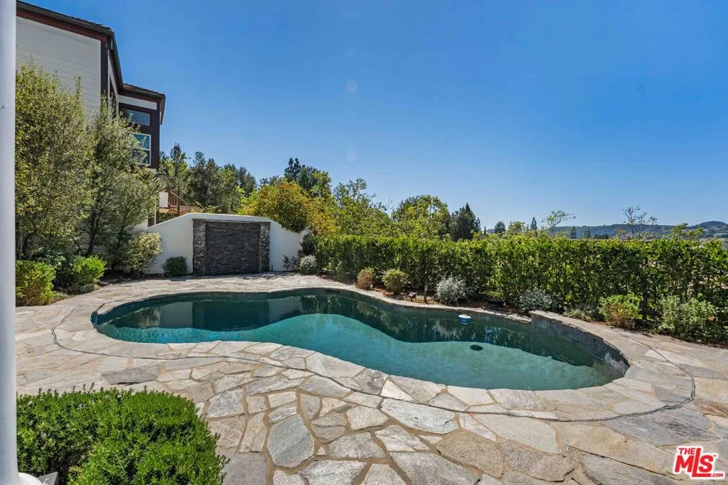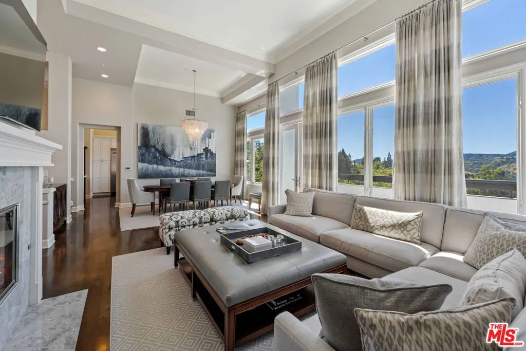 Welcome to 2427 Cobham Ct an impeccably updated split level residence nestled within the prestigious 24-hour guard-gated community of Bel Air Crest, offering breathtaking views of the canyon and Mountain Gate Country Club. This stunning 3,503 sq ft home features 4 bedrooms plus a private dedicated office, two luxurious primary suites, and 5 baths, all thoughtfully designed with high-end finishes throughout.Step inside to soaring ceilings, rich dark hardwood floors, and an abundance of natural light pouring through walls of floor-to-ceiling windows and French doors. The elegant living room centers around a marble fireplace and opens seamlessly to the formal dining room, crowned by a dramatic capiz shell chandelier. The chef's kitchen is a showpiece, featuring white shaker cabinetry, marble countertops, a Viking refrigerator, professional-grade range with custom hood, Bosch wall ovens, a center island, and a picture window above the sink perfectly framing the canyon views. A charming breakfast nook with custom built-in banquette seating and a butler's area with beverage refrigerators completing the main level's entertaining spaces.The primary suite is a true retreat appointed with a fireplace, spa-caliber bath, dual vanities with marble counters, soaking tub, oversized glass shower, generous built-in storage, and sitting area. A versatile den can serve perfectly as a 4th bedroom or a second home office, while a stylish powder room and dedicated laundry room add everyday convenience.Outside, the resort-style grounds are an entertainer's dream. A sparkling pool and spa are surrounded by expansive natural flagstone patios, a covered loggia, a built-in BBQ kitchen with stone surround and bar seating, multiple al fresco dining and lounge areas, and lush mature landscaping all framed by sweeping canyon and golf course views. A private balcony offers additional outdoor space to soak in the scenery.The finished two-car garage features epoxy flooring and custom built-in cabinetry. Residents of Bel Air Crest enjoy world-class community amenities including a clubhouse, pool, tennis courts, and 24/7 guarded gate entry. A rare opportunity to own a fully updated, move-in ready home in one of Los Angeles' most coveted guard-gated communities.