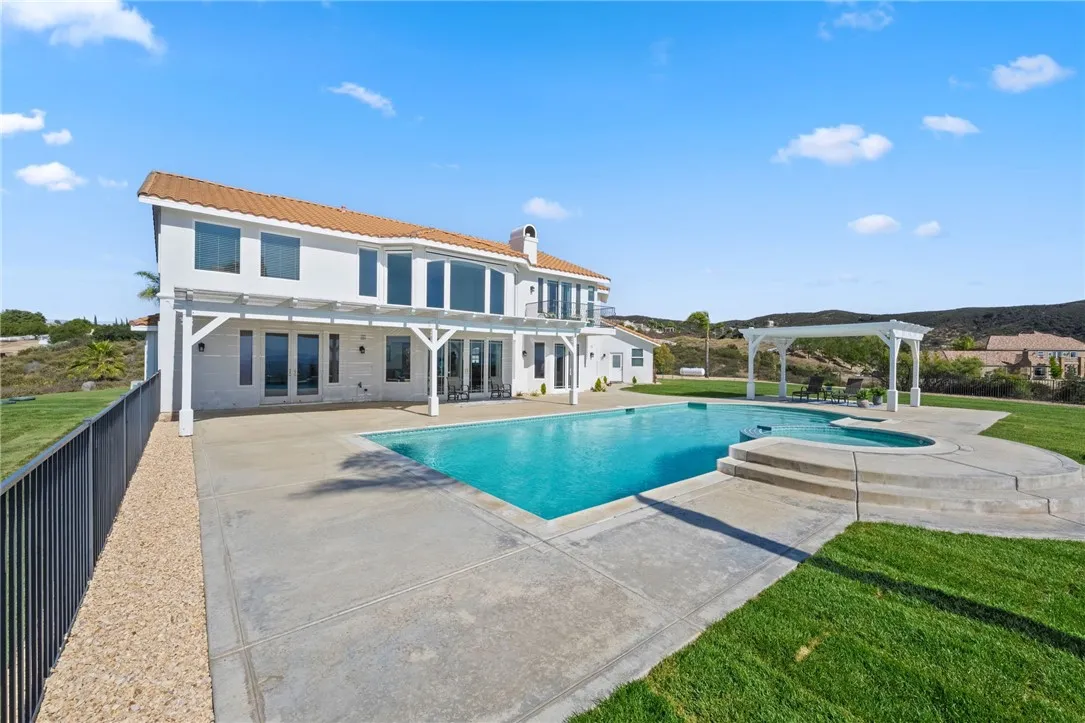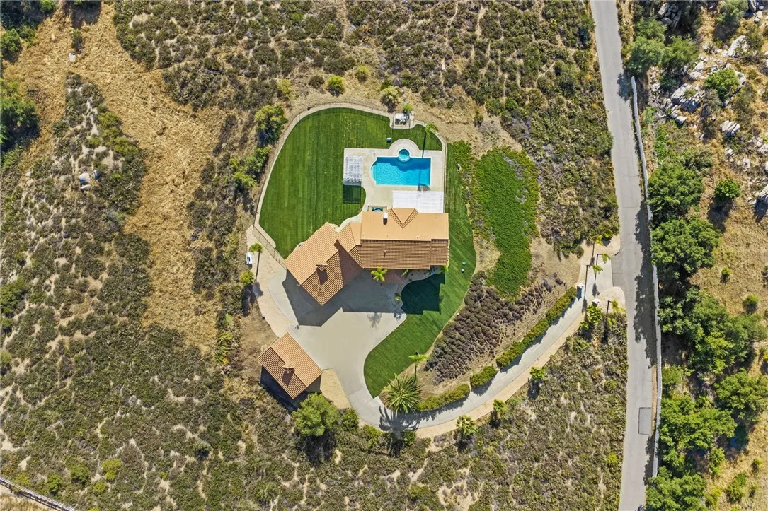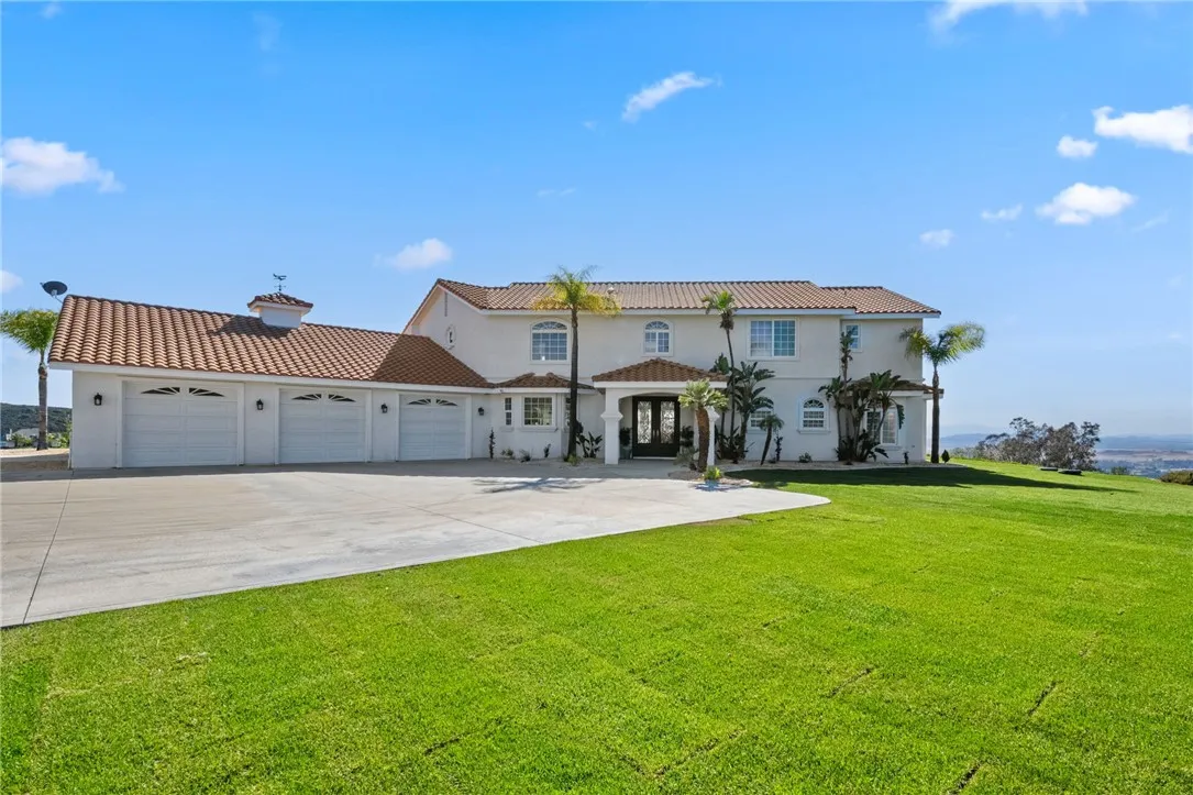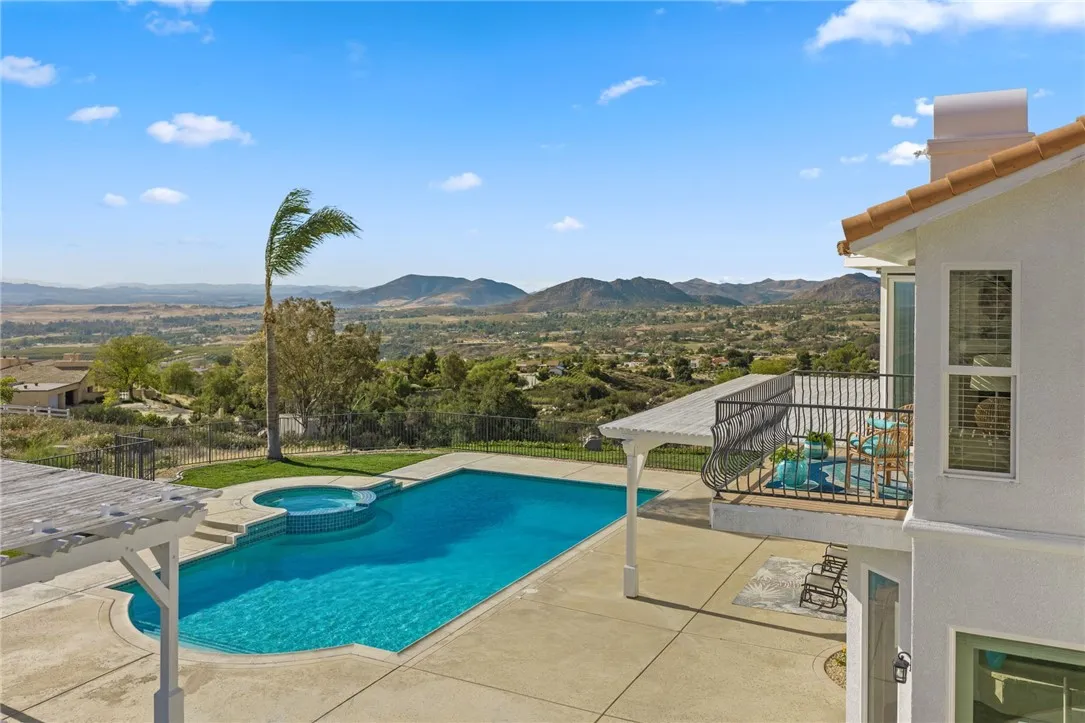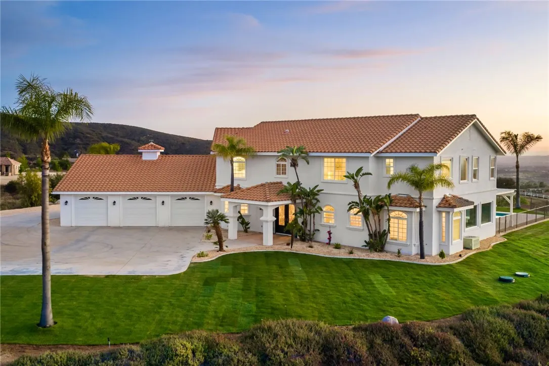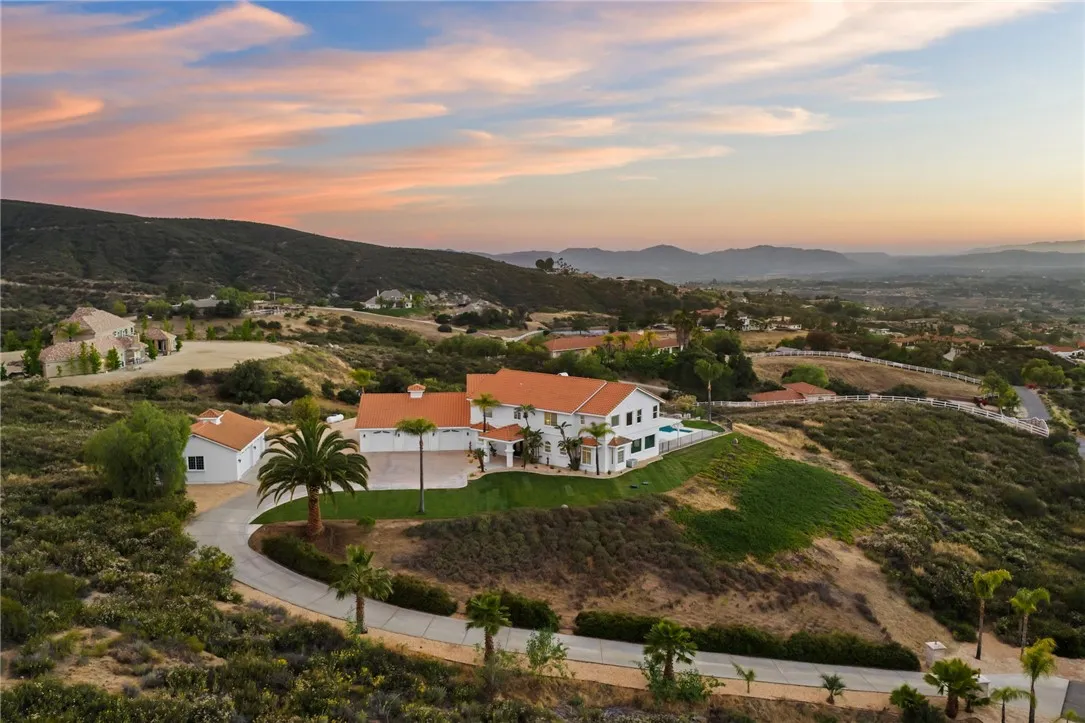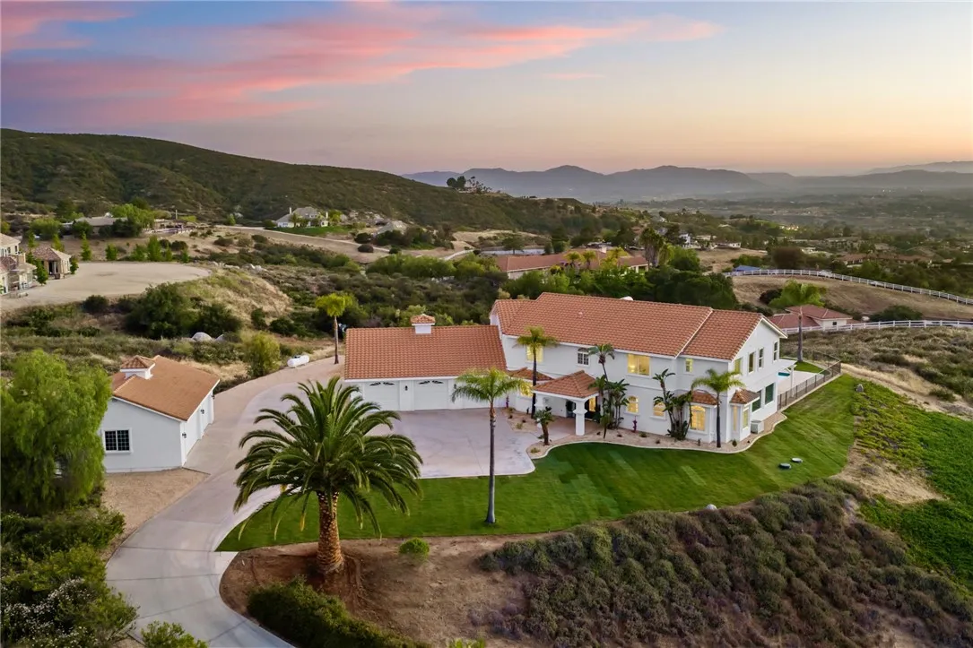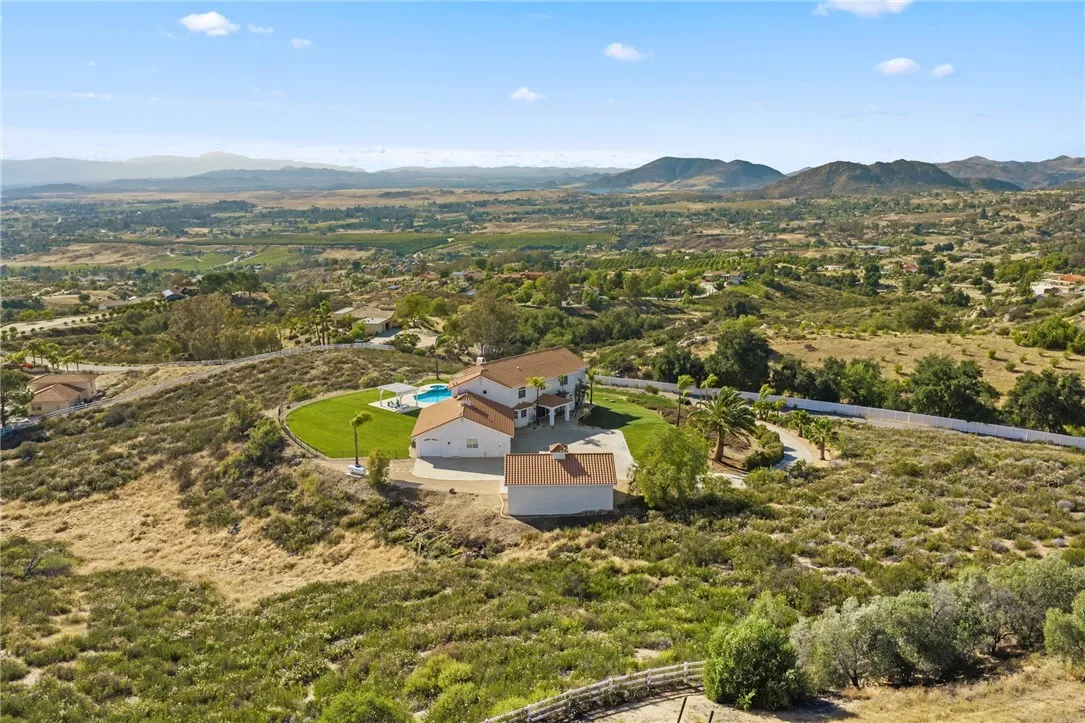 Welcome to this exceptional home in one of Temeculas most desirable locations, perched on top of a hill in Glen Oaks. With panoramic sunset views, city lights and hot air balloon sightings, this home offers a lifestyle that is truly hard to replicate. Situated on nearly 5 acres, this home was built in 2001 with a serene setting with freshly landscaped front and back lawns. The backyard is an entertainer’s dream, complete with a sparkling 43x20 pool and spa, all perfectly positioned to take in the views. Large windows throughout the home flood the interior with natural light and frame the scenery from nearly every room, while 20 foot ceilings create an open and inviting atmosphere. Spanning 4,230 sq. ft. this home features 5 bedrooms and 3.5 bathrooms, including two conveniently located downstairs bedrooms, along with a full bathroom and a guest bathroom. As you enter, you’re immediately welcomed by views of the backyard, the pool, and the bright open layout, with a central fireplace connecting the family and dining rooms. An additional downstairs room offers the perfect space for a home office with inspiring views. Car enthusiasts and those desiring extra space will appreciate the garage setup, featuring an oversized 3 car garage, an additional 2 car garage with separate access, and a detached 3 car garage, ideal for an ADU, Airbnb, workshop, or additional storage, bringing the total to 8 garage spaces. Upstairs, the layout continues to impress. The primary suite is privately situated and includes two large walk in closets, a fireplace, private balcony, spacious bathroom with dual vanities, and a versatile bonus room ideal for a nursery, office, or sitting area, all overlooking the stunning landscape. Just outside the primary suite is a conveniently located laundry room. Across the catwalk, you’ll find two additional bedrooms, each featuring spacious walk in closets and connected by a Jack and Jill bathroom. Just outside the bedroom is a library style bookshelf with lighting and continued views completing this thoughtfully designed space upstairs. Original owners have made numerous updates adding comfort and efficiency to the home. Ideal location in Glen Oaks, with paved roads, without the burden of HOA, this home offers low taxes, close proximity to wineries, and a setting that captures the very best of Temecula living. This is truly a special property that must be experienced in person. This is truly a special property that must be experienced in person.