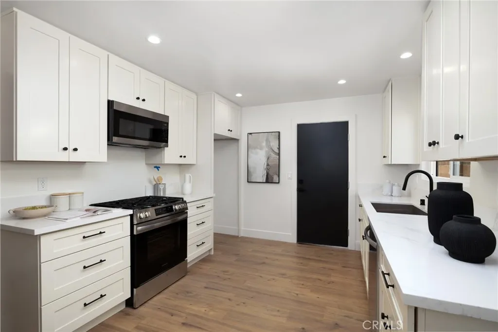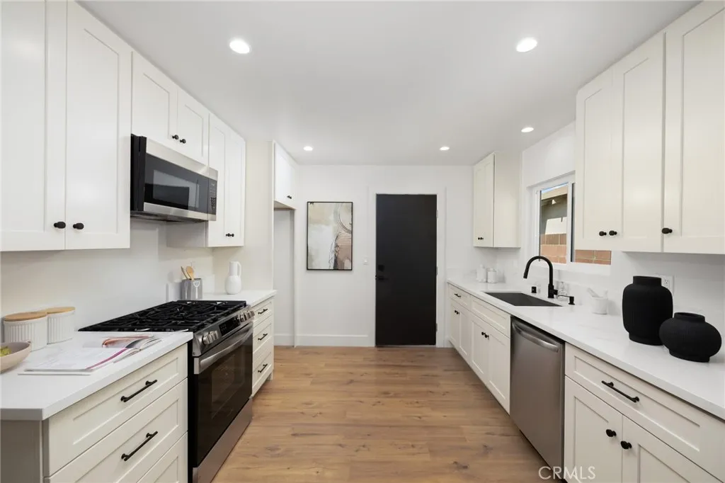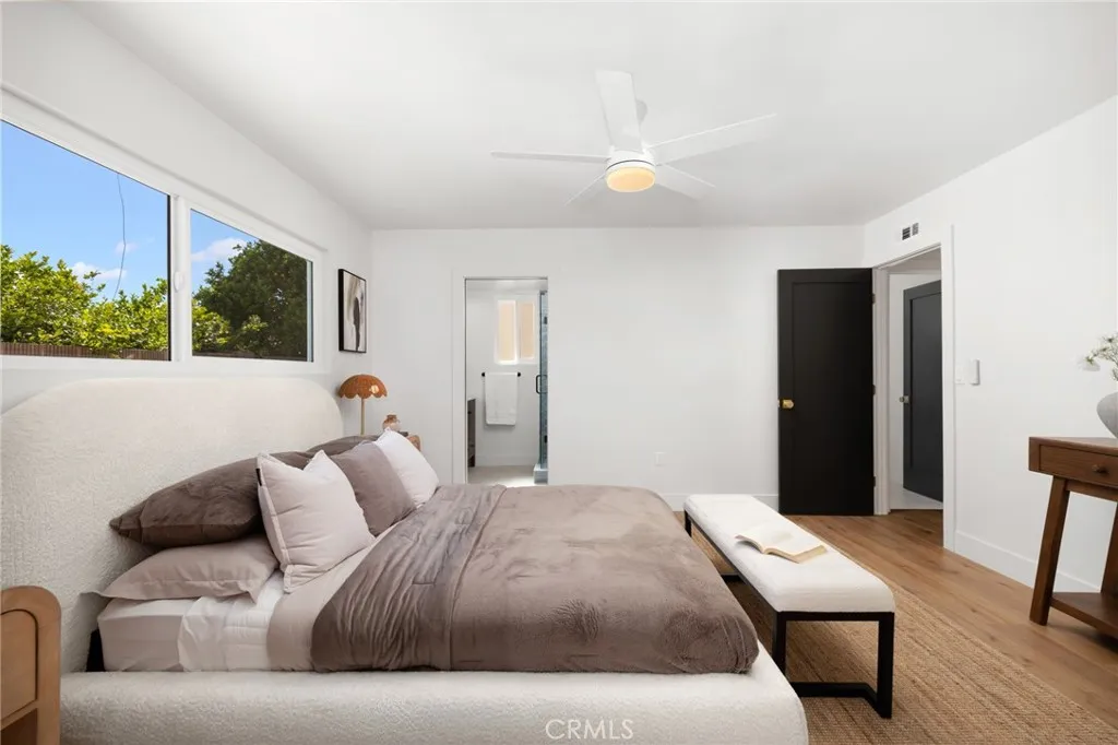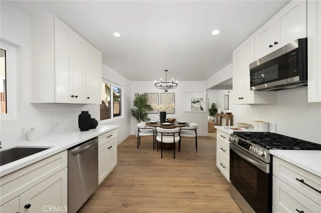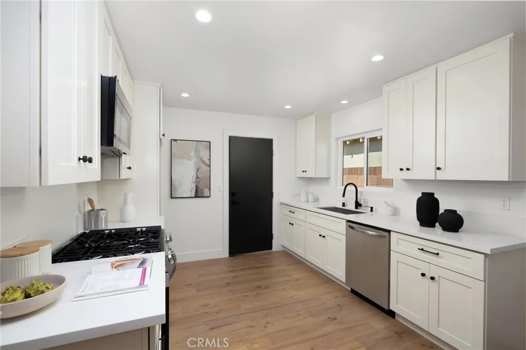 Tucked into a well-established Baldwin Park neighborhood, 13518 Elwyn Dr delivers the ideal blend of style, function, and value. Fully reimagined and completely move-in ready. From the moment you arrive, refreshed landscaping and fresh exterior paint set a clean, modern tone. Inside, warm oak-style laminate flooring flows throughout, paired with fresh interior paint, new baseboards, and abundant recessed lighting that creates a bright, open feel. The redesigned kitchen is the centerpiece, featuring beige shaker cabinetry, Calacatta quartz countertops, stainless steel appliances, and updated fixtures built for both everyday living and entertaining. Both bathrooms have been thoughtfully upgraded. The primary suite offers a private retreat with a dual vanity and custom-tiled walk-in shower with glass enclosure, while the hall bath features a new tub, tile surround, and modern finishes. Major improvements bring peace of mind, including a 200-AMP electrical panel, updated electrical, serviced roof, new windows and a sliding glass door. Additional upgrades include new interior doors, updated plumbing components, ceiling fans, mirrored closet doors, and a finished garage with direct access. The backyard includes a detached shed for added storage or workspace, with a manageable lot size perfect for low-maintenance living. Professionally cleaned and staged, this home shows like a model. Ideal for a young family or buyer looking to move up into a turnkey home in a central location at a great value. This is an opportunity you don’t want to miss. Schedule your private showing today.