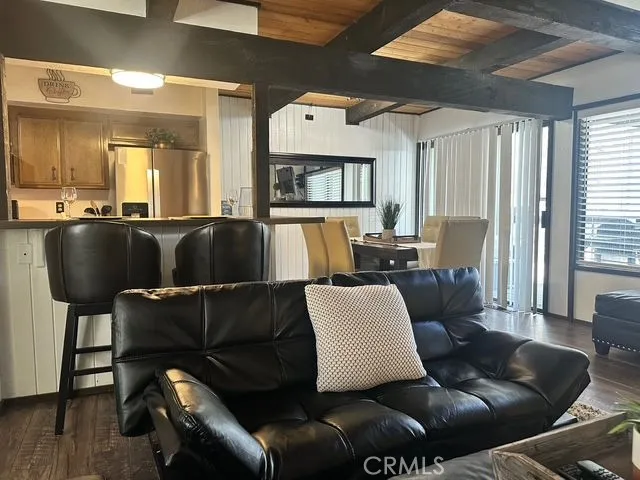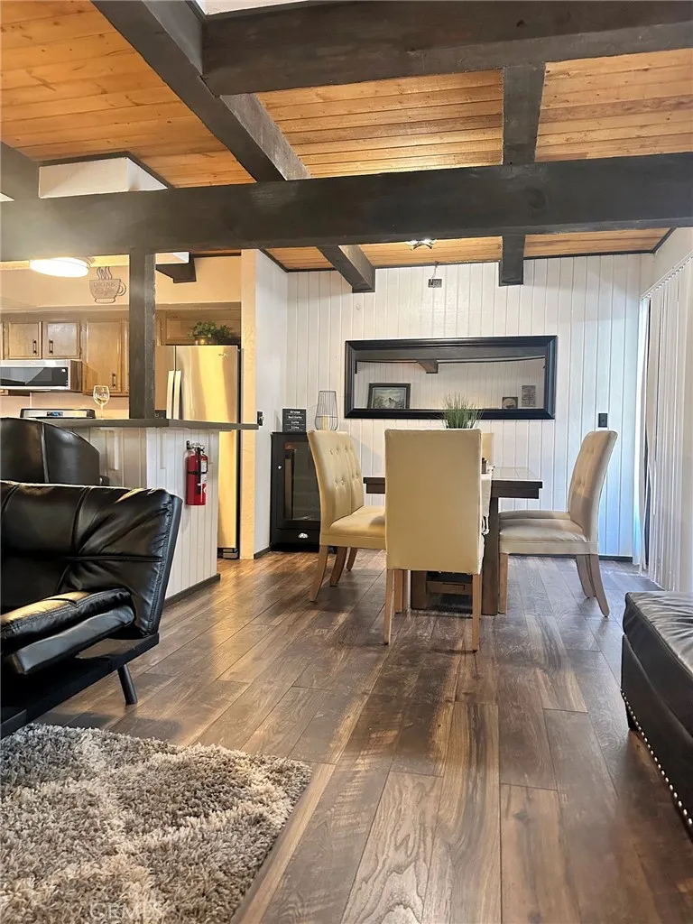 This home has great quality wood flooring on the main level. Beautiful wood high-beamed ceilings give it a modern rustic feeling as it appears open and airy with great views of the beautiful trees and blue sky from all of the rooms. Amenities include a stackable washer and dryer in a closet enclosure away from the living area. Central heating and a gas starting fireplace keep you warm in the winter months while there are cooling units for the warmer months. A lot of attention to details in this home. The living room has a pull out sofa bed too. The sleeping accommodations allow for many people staying in the home or a plus for short term rentals. It is tastefully decorated and furnishings are included adding great value. The deck is wonderful for barbeques and outdoor relaxation. Another plus is the convenient premium parking spot next to the home. All of the grounds are beautiful, and very well maintained making it great for leisure walks or bike riding. Perfect for outdoor living and enjoyment. It is within short driving distance to all of the awesome amenities that make Big Bear Lake a highly desired place to visit and live. Truly a great property in a prime location. Onsite property manager. Turnkey ready! Don't pass up the opportunity to make this home your own while it is the lowest priced unit in the complex. Has awesome rental income if you are looking for an Airbnb investment. It is rented throughout the year. Gross rental income in 2025 =$26,243. Gross rental income January 2026 was $7,920. One of the lowest in the Snow Summit area. Same floor plan unit sold this year for $600,000! Must see to truly appreciate.