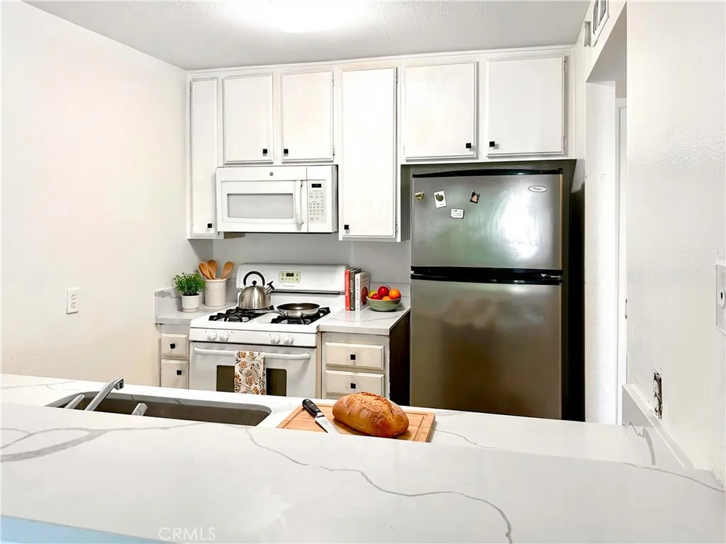 This incredible 1+1 freshly painted penthouse unit with vaulted ceiling is very bright with views of the trees and close proximity to area shops and restaurants. Great complex with a lot of trees and greenery. Spacious living room with fireplace and large balcony with storage. Open kitchen with brand new Quartz counter tops and breakfast counter. Dining area. Primary bedroom with vaulted ceiling and walk-in closet. Washer and dryer hook-ups in the closet. Full hallway bathroom. Other features include wood and tile floors, plenty of closet space. Small complex with pool and spa. Gated garage with 2 car parking. Plenty of guest parking. Prime location.
