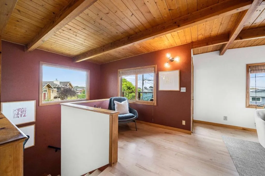 Sensational hardwood floors on the upper main level and exposed beams with finished cedar ceilings create a warm environment. The stunning wood encasement windows create a distinctive look and excellent climate control. The home was originally custom built by a contractor for himself and upgraded by the current owners. The generous use of granite and glass in the kitchen and bathrooms offer decorator touches. Decks off the living room, primary suite and family room help bring the outside in. The family room enjoys a gas fireplace and may also be used as an additional bedroom. Located just a short distance to the Fitzgerald Marine Reserve to the north and the Open Space trails to Princeton Harbor to the south, outdoor activities are just out the door. Splendid protected gardens in the front add a quiet entertainment area for enjoyment. This westside Moss Beach home is located just 20-30 minutes to downtown San Francisco and SFO International Airport. Silicone Valley is also a short distance to the south.