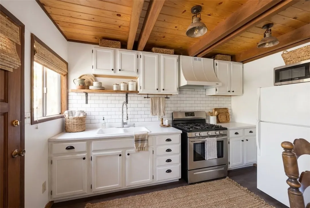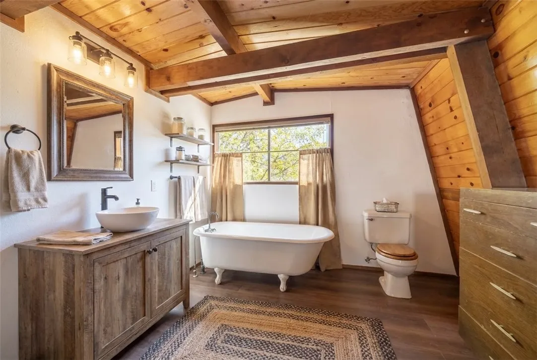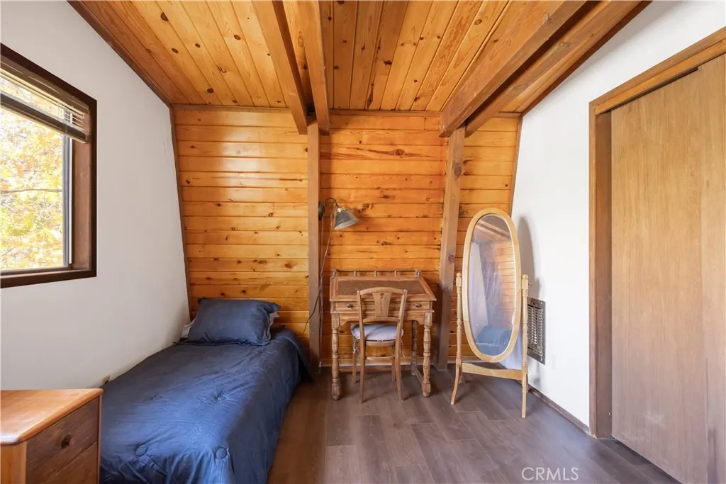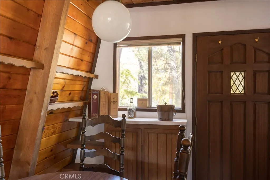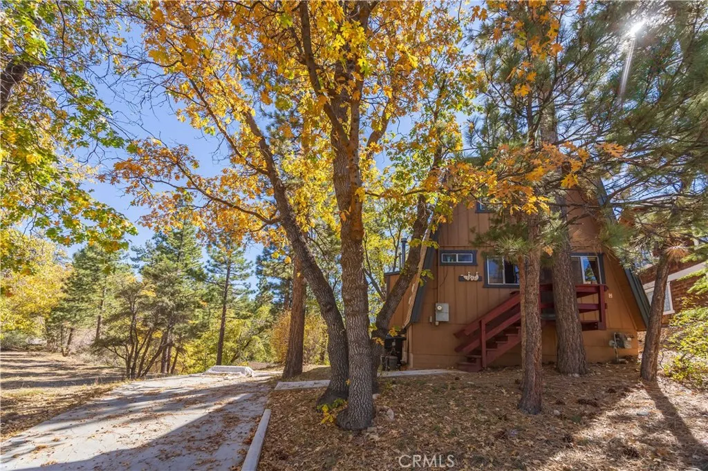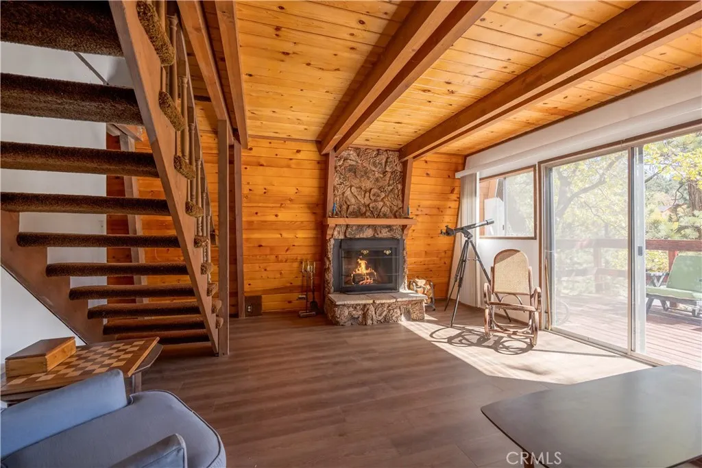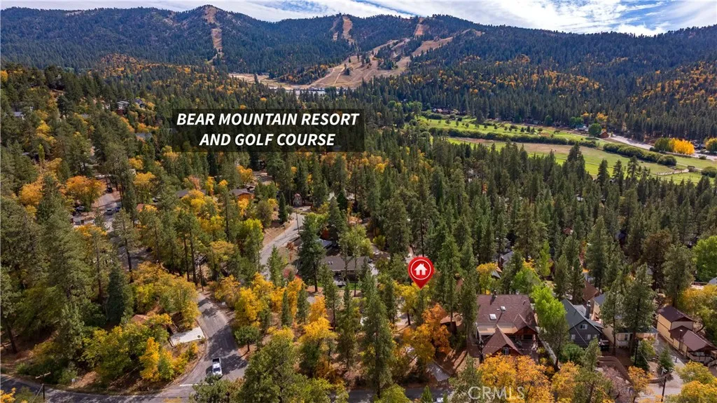 This turnkey 2-bed, 1-bath gambrel cabin welcomes you with 896 sq ft of cozy mountain charm, featuring wood-beamed ceilings, a classic rock fireplace, a spacious open-concept kitchen with a brand-new recessed gas wall heater, a dining area that opens to the backyard for entertaining, a downstairs bathroom, and two generous upstairs bedrooms with the practical option to add a second bath between them. Set on a 5,040 sq ft treed lot and sold fully furnished, the home offers warm rustic character and stunning year-round views of Bear Mountain Ski Resort—snow-covered runs in winter, lush greens in summer, and vibrant fall colors right from your living room or front porch. Enjoy peaceful mornings with wildlife wandering by, and then take full advantage of its prime Moonridge location just minutes from Bear Mountain’s lifts, a short stroll to the Big Bear Alpine Zoo, and close to the lively Moonridge shopping corridor.