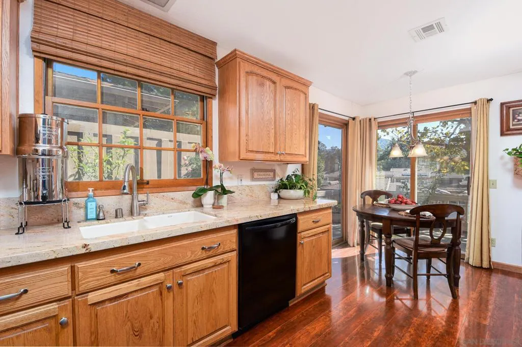 Welcome to this beautiful single-story home with a view! 3 bedroom 2.5 bathrooms with a 2-car attached garage. Largest floor plan in the community and rarely available. This home sits up high perched on an elevated lot on a quiet cul de sac! This amazing home offers privacy and views! Ideal layout with comfort and space in mind. One of the most sought after communities in North Escondido surrounded by the beautiful Castle Creek golf course! Tall soaring ceiling in the spacious living room with a rock fireplace and charming window seat to soak in the views. Wrap around patio with a gated entrance. Rich hard wood floors, granite kitchen counter tops and upgraded bathrooms make this home move in ready. Ideal layout with an oversized primary suite with a retreat and cozy patio to enjoy your morning coffee. Jack and jill bathroom for the guest suites plus a powder room for company. This home is very unique with all the dark wood window trim and base boards giving the home world class charm and warmth. Tour this beauty today!