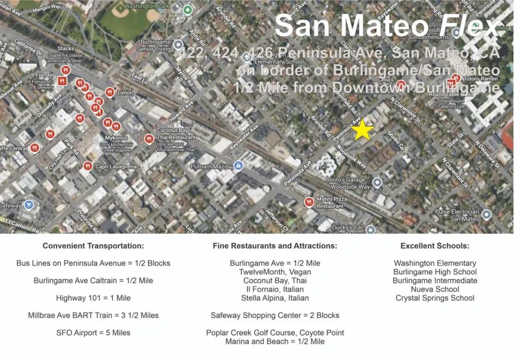 Office building permissible for preschool, school, medical, lab, wide variety of purposes including 3 residential, new housing dev. Use as triplex requires adding showers, other improvements. For Lease or Sale. Reception, 9 Private Offices, 1 Large Conference Room, 3 x 2 Restrooms, Break Room, Outdoor Patio 1/2 mile, Walking Distance to Burlingame Caltrain. Zoning Summary: Administrative, executive, and professional offices, provided that the professional offices are limited to those professions listed in Section 5.24.160: accountant, appraiser, architect, assayer, attorney, auditor, bacteriologist, certified public accountant, chemist or laboratory specialist or operator, chiropodist, chiropractor, civil engineer, dental laboratory specialist or operator, dentist, electrical engineer, geologist, hydraulic engineer, medical laboratory specialist or operator, oculist, optician, optometrist, osteopath, physician, structural engineer, surgeon, surveyor, and veterinarian (check for kennel). Retail of goods and services, Restaurants, Health and recreation, Schools, day care, Financial, business offices, laboratories. Warehousing, storage, and distribution. Residential, R3 multi-family. Special Uses: clubs, hotels, religious, kennel, community center, schools.