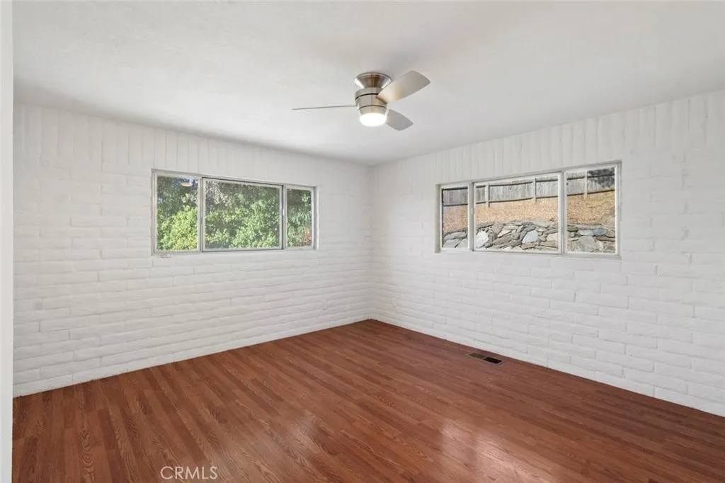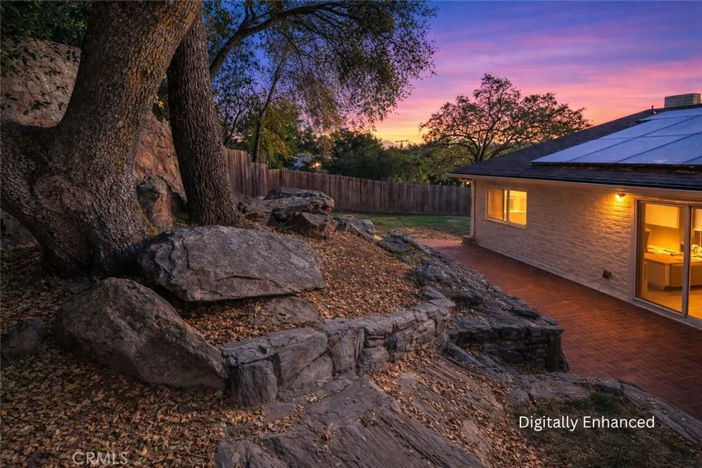 Perched among mature oaks and custom stonework, this beautiful two-story home blends mid-century charm with modern updates and versatile living spaces. This unique home showcases thoughtful craftsmanship and unique architectural details that set it apart from anything else you've seen. Upstairs, you'll find a bright, inviting living space with large picture windows that flood the home with natural light. The open layout connects the living room, dining area, and kitchen seamlessly, creating a perfect environment for gathering and entertaining. The living area features fresh paint, warm flooring, and hillside views, while the kitchen boasts updated counters, freshly refinished cabinetry, and a large window that overlooks the oak-filled backyard. Down the hall, two spacious bedrooms feature generous proportions and beautiful natural light, with peaceful views of the property's natural landscaping. The hallway bathroom has been recently remodeled with a new tub and shower surround, new fixtures, and modern lighting for a clean, bright feel. The primary suite offers ample room, dual windows for light and air, and a freshly remodeled en-suite bathroom complete with a new vanity, new shower surround, and tasteful finishes. Downstairs, a completely separate living area provides incredible versatility. This studio-style space features a huge living area anchored by a custom fireplace, sleek concrete floors, fresh paint with accent wall, and new lighting throughout. The attached kitchenette and full bathroom make it ideal for multi-generational living, a private guest suite, or potential rental income - a perfect opportunity for flexibility and independence. Outside, the backyard is an absolute showpiece - a one-of-a-kind combination of artistry and nature. Handcrafted local stone retaining walls, large brick patios, and massive decorative boulders weave together into a tranquil, low-maintenance landscape under the shade of mature oak trees. It's the kind of outdoor space that feels timeless, peaceful, and truly connected to its surroundings. Additional highlights include a two-car garage, solar energy system for efficiency and savings, and a location in one of the most desirable pockets of the foothills - where privacy, craftsmanship, and character converge. Welcome Home!!!