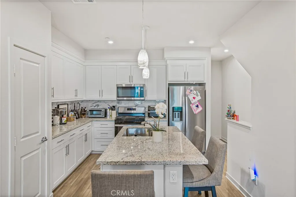 Beautiful newer-built tri-level townhome in the highly sought-after Stafford Place Community of Covina. This spacious 3 bedroom, 3 full bath home offers an open, light-filled floor plan perfect for modern living. The chef-inspired kitchen features a large island, stone countertops, and sleek white cabinetry, opening to the expansive great room and private balcony—ideal for entertaining or relaxing.