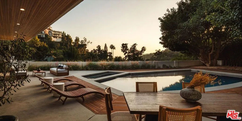 Privately positioned at the crest of the prestigious Rising Glen enclave, this refined hillside sanctuary commands sweeping views over Sunset Plaza, the cityscape, and the Pacific Ocean beyond, offering a rare sense of tranquility high above it all. Framed by lush natural surroundings and set well above the street, the residence enjoys a peaceful, elevated vantage point that feels worlds away while remaining moments from the iconic Sunset Strip. The home has been thoughtfully reimagined with a curated eye for timeless design, blending elevated finishes with warm, organic materials throughout. Sun-filled interiors are anchored by a bespoke chef's kitchen featuring custom cabinetry, integrated appliances, and a sculptural stone island that seamlessly connects to the living and dining spaces. Skylights and expansive walls of glass invite natural light from every angle, enhancing the home's open, airy atmosphere and drawing the outdoors in. Floor-to-ceiling sliding doors open to an expansive terrace designed for effortless indoor-outdoor living. A resort-style pool and multiple lounge areas create a private outdoor oasis ideal for entertaining or quiet moments of retreat, all set against a dramatic hillside, city, and ocean backdrop. Thoughtfully composed and exceptionally serene, 1820 Rising Glen offers an elevated living experience in one of 90069's most coveted hilltop settings overlooking Sunset Plaza.