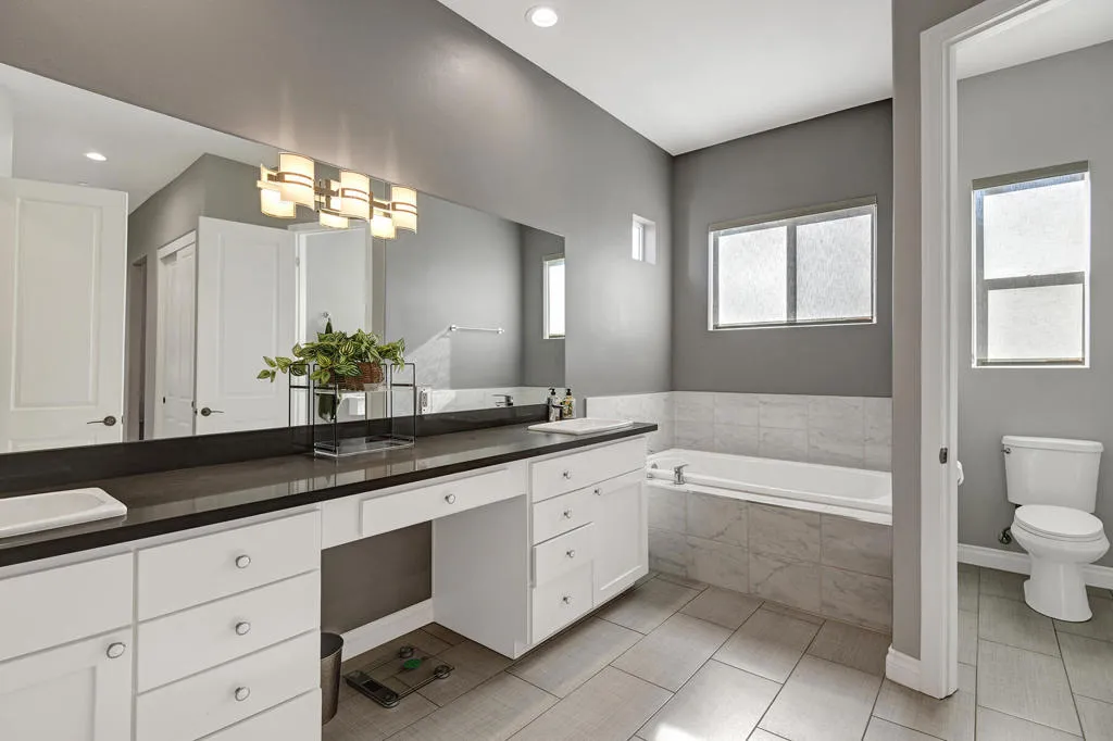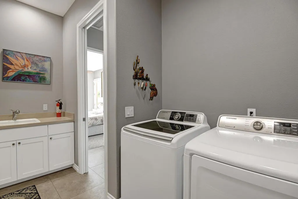 A rare opportunity to own a custom-built residence completed in 2015, thoughtfully designed with enhanced openness, 11-foot ceilings, and superior attention to quality, efficiency, and detail throughout. Offered furnished with all new designer furniture, this 3-bedroom, 3.5-bath home spans 2,644 sqft and is ideally positioned on a nearly 1/4th Acre corner lot within the desirable Desert Cove gated community with low HOA's. The expansive great room showcases a sleek linear fireplace framed by a dramatic stacked-stone feature wall, custom built-ins, and surround sound, seamlessly flowing into the gourmet kitchen--perfect for both everyday living and elevated entertaining. The kitchen is anchored by an oversized 10-foot granite slab island with prep sink, complemented by quartz countertops, top-of-the-line KitchenAid stainless steel appliances, including a commercial-grade cooktop, and a spacious pantry with custom storage and etched glass doors. Adjacent, a stylish den functions as a dedicated bar area with built-in cabinetry and an undercounter beverage cooler, creating an ideal space for hosting. Light-filled interiors are enhanced by plantation shutters and a well-designed floor plan offering exceptional privacy, with all three bedrooms featuring ensuite baths finished with quartz countertops. The primary suite is a true retreat, boasting dual walk-in closets with custom organizers and dual private toilets. Additional highlights include a three-car garage with central vacuum system and tankless water heater, along with a new security system and cameras for peace of mind. Outdoors, the south-facing backyard captures mountain views and delivers a resort-style experience with a saltwater Pebble Tec pool and spa, covered tiled patio with surround sound, oversized covered BBQ and bar area with vibrant epoxy countertops, space for a refrigerator, gas stub for a future firepit, artificial turf, landscape lighting, lush greenery, and a private outdoor shower--creating a true entertainer's oasis. Centrally located and impeccably appointed, this exceptional home offers refined desert living with modern luxury, privacy, and effortless indoor-outdoor enjoyment.