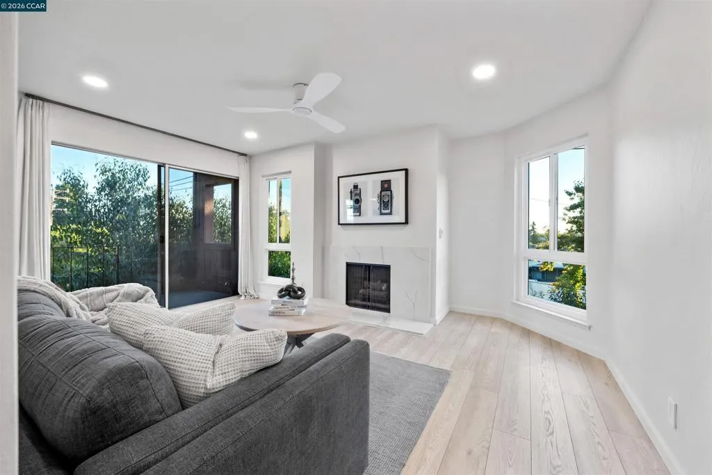 Price Improvement! Perched on the top floor & wrapped in natural light, this fully remodeled corner-unit condo feels like a chic, urban sanctuary. Every inch has been thoughtfully reimagined to create a space that feels elevated, warm, and instantly welcoming. Inside, elegance shows up in the details: a sculptural wabi-sabi ceiling light, striking gold fixtures, and sparkling Bannerman laminate floors that give the home a subtle, glamorous glow. The modern kitchen updated with quartz countertops, redwood maple veneer cabinetry in fresh white and blue tones, and sleek stainless steel appliances perfect for entertaining. The bathroom feels like your own private spa with a lighted mirror, and sophisticated gold accents, with portable electric heaters adding an extra layer of cozy comfort. Throughout the home, dimmable warm lighting lets you set the mood, while new energy-efficient windows bring in sunshine and help soften the sounds of the city. Step out onto your private balcony to sip your morning coffee or unwind in the evening, taking in the neighborhood scene from your elevated vantage point. With secure garage parking & easy access to Kaiser, BART. Lake Merritt, parks, restaurants, and shopping, this condo offers the the ideal blend style, convenience and lock-and-go ease.