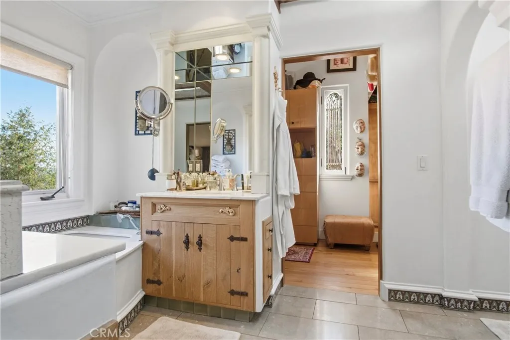 Perched atop Grand View Blvd, this custom-built artist's estate sits on a nearly a 10,000 sq ft lot. Two-story main home is California-Spanish style with mission tile roof. Across the salt pool is full sized Guest house and Garage/Studio. The main home has 4 bedrooms and 5 bathrooms, including a spacious upstairs primary suite with two patio balconies facing ocean and mountains including a wood burning fireplac. California-spanish charm throughout with huge reclaimed wood beams and doors, multiple decks, and seamless indoor–outdoor flow. The foyer opens to a living room with Moroccan-tile fireplace, leading to a family room, dining room, and open cook's kitchen with center island, custom tilework, and cabinetry. Three additional bedrooms and 3 bathrooms on the main level. The entertainer’s backyard includes a brick pizza oven, large patio, yard, and saltwater pool/spa. The guest house with kitchen and bath sits below a rooftop viewing deck offering nearly 360-degree views of Mar Vista from the Hollywood Sign to the ocean. Truly, a one-of-a-kind property.