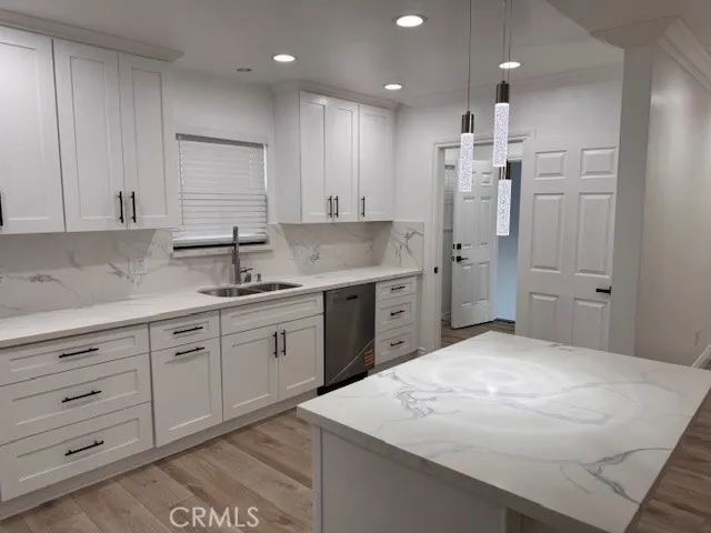 Newly remodeled home, move-in ready. This 3-bedroom, 2-bath house offers 1,246 sq. ft. of light-filled, well-designed living space. Renovated from top to bottom, the home features an open floor plan with new wood-style flooring, fresh neutral paint, recessed lighting throughout, upgraded light fixtures, ceiling fans, and abundant natural light. New doors and windows with white faux-wood window blinds throughout enhance the homes style, comfort and energy efficiency. The redesigned kitchen opens seamlessly to the living and dining areas and showcases stunning countertops, beautiful backsplash details, a center island with bar seating, bright white cabinetry, and new appliances—ideal for both everyday living and entertaining. Matching upgraded countertops and coordinating backsplashes extend into the remodeled bathrooms, offering clean, modern finishes.
