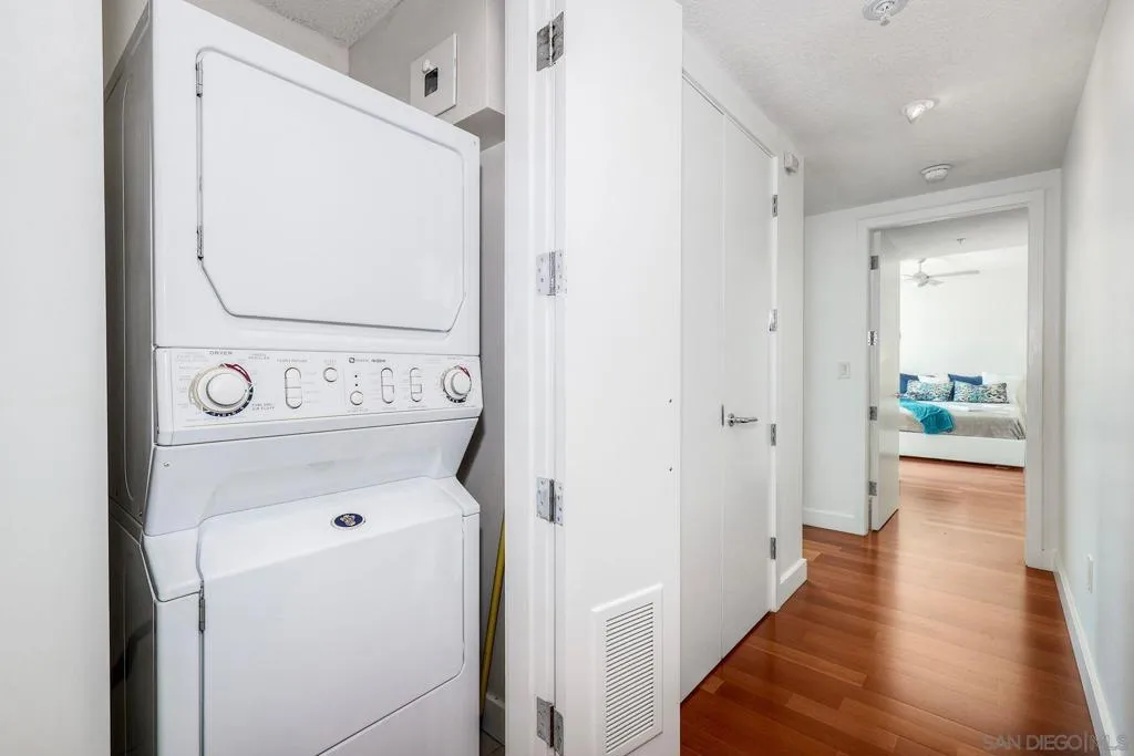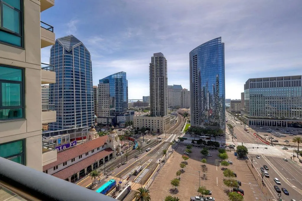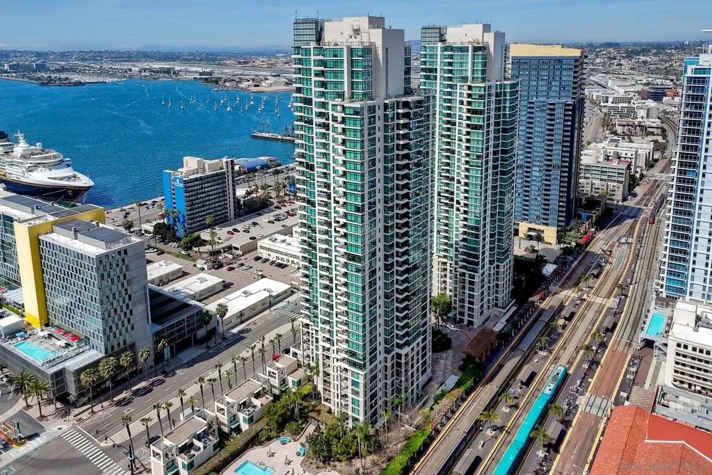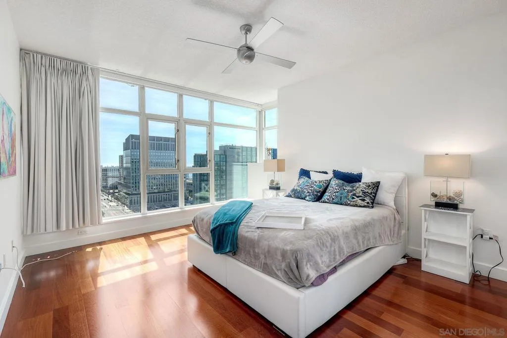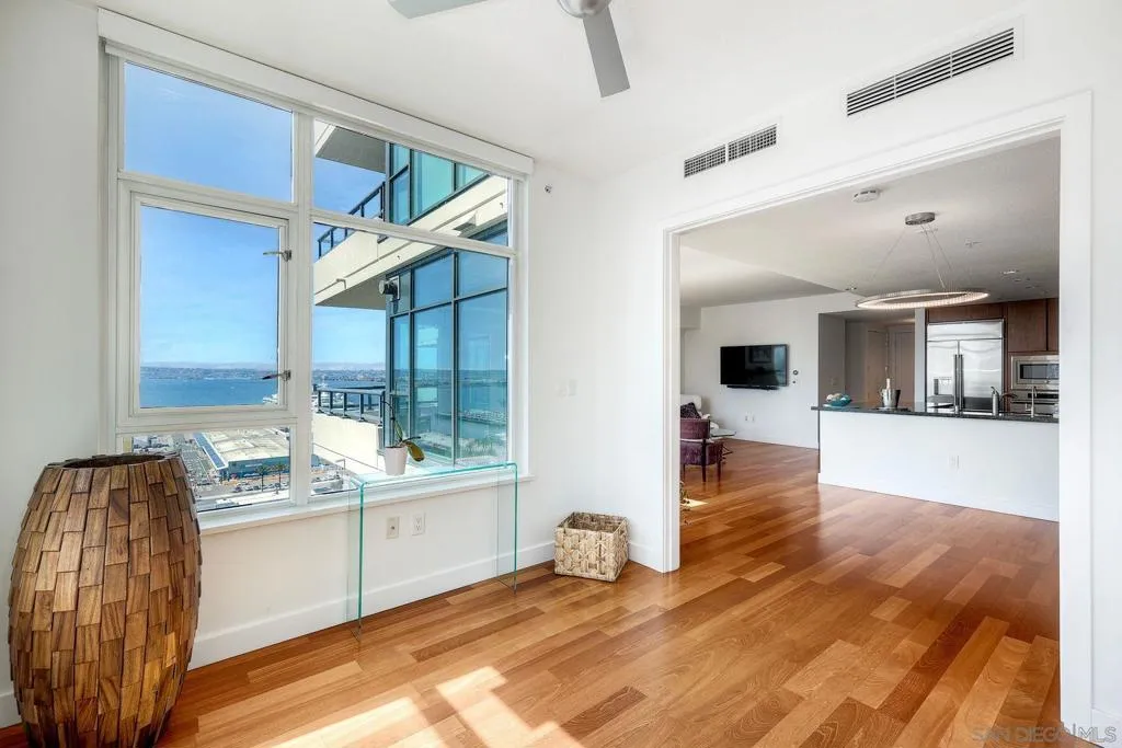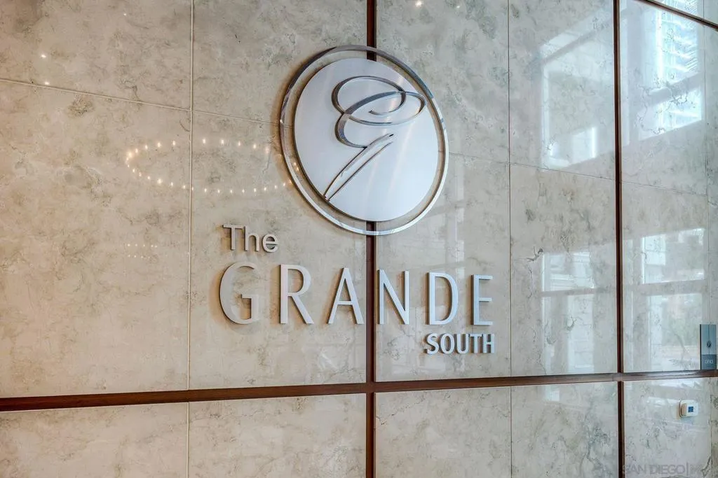 Elegant ocean and bay view residence in Grande South featuring the most desirable floorplan with two bedrooms plus a bonus room. Situated on the 18th floor, the home offers unobstructed southwest-facing views of San Diego Bay, the Pacific Ocean, and the city skyline. Refined interiors include a spacious primary suite, hardwood floors throughout, a cozy fireplace, Nest thermostats, battery-operated window shades, and a gourmet kitchen with a new GE Monogram refrigerator. The expansive balcony extends the living space and provides the perfect setting to enjoy panoramic views and sunsets. 2 side by side parking spaces. Grande South amenities include 24-hour concierge service, meeting room, party room and lounge with full kitchen and fireplace, visitor’s suite for guests, landscaped gardens, private tree-lined courtyards, individual storage lockers, bicycle storage, an 80-foot outdoor swimming pool, whirlpool spa, sauna and steam rooms, changing rooms with lockers, and a fully equipped exercise room. Floor plan is in associated documents