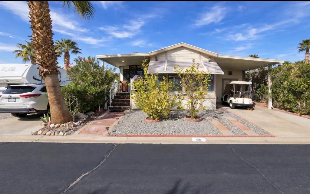 Located in The Sands RV & Golf Resort, this home offers a comfortable layout with good natural light and functional use of space. The interior includes generous built-in storage and an extended living area that has been converted into a secondary bedroom, providing added flexibility for guests, office space, or additional sleeping quarters.The property features front and rear access with sliding doors, creating an easy indoor-outdoor flow. A patio expands the usable living space and offers a private setting for everyday enjoyment.A separate shed adds valuable utility and includes a washer and dryer, with enough space to park a golf cart or use as additional storage. The home is being sold fully furnished with appliances, including washer and dryer, making it a convenient option for full-time or seasonal living.Residents enjoy access to a wide range of resort-style amenities including golf, swimming pools, pickleball courts, a hibachi court, three dog parks, a pond, gym, clubhouse, spa, and social activities, all within a gated, well-established community. Conveniently located minutes from Palm Springs, Palm Springs International Airport, and just a short drive to the I-10 freeway, offering easy access throughout the Coachella Valley.
