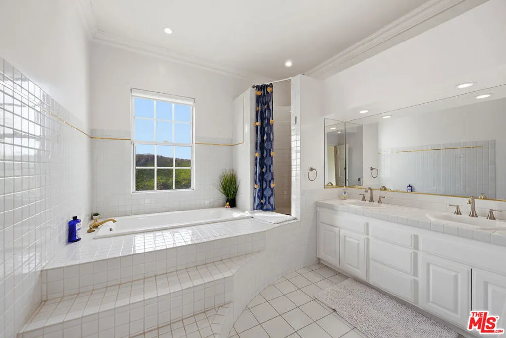 Set on over two acres in a private Topanga setting, on the Malibu border, this expansive single-family residence offers sweeping views spanning from the ocean to the surrounding canyon and valley. Thoughtfully positioned for privacy and positioned behind its own gates, this view-oriented property creates a serene, retreat-like environment.The grand entry leads to a light-filled living room which features an open floor plan with soaring beamed ceilings, floor-to-ceiling windows, and a designated bar, making it a wonderful space to entertain. The chef's kitchen is equipped with high-end appliances, granite countertops, a center island, a wine fridge, and a sunny breakfast area that flows into the adjacent family room. In addition to a private dining room, the entry level also includes 3 bedrooms, one serving as a downstairs secondary primary, a "glass box" office, laundry and 3-car garage. Five bedrooms and four and half bathrooms, spanning over 5,154 sq/ft, provide flexible living options, including a spacious primary suite with a fireplace, private balcony, generous walk-in closet, spa-style bath with custom oversized shower and a sitting room/library which makes a great place to escape for some quiet time. Also on this second level there is an oversized en suite guest bedroom. Great floor-plan! Outdoor amenities include a covered al fresco dining area, built-in BBQ area, designated basketball playing area, plenty of parking, an outdoor hot-tub, large vegetable garden with a variety of fruit trees including citrus, figs and even nut trees. Also worth mentioning there are several lookout platforms with seating, bird/chicken enclosures, and a grassy lawn. The lushly landscaped grounds enhance the sense of seclusion while remaining conveniently located on the border of Malibu & Topanga, giving multiple options to reach downtown Malibu, Ventura Blvd, and the local shops and restaurants in Topanga.
