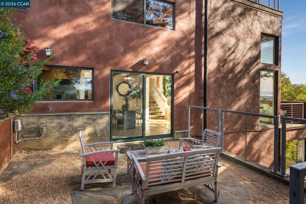 Tucked away in the Berkeley hills, this stunning 2012-built home offers the perfect blend of modern comfort and peaceful seclusion, surrounded by majestic redwoods and framed by breathtaking Bay views. Enjoy sweeping vistas of the Golden Gate Bridge, Oakland, and the San Francisco skyline through expansive wall-to-wall windows that flood the home with natural light. Soaring ceilings and beautiful custom woodwork create a warm, elevated feel throughout. A rare newer build for the area, this home offers privacy, nature, and convenience all in one, just a 10-minute walk to the UC Berkeley campus. Private parking above the home provides space for two cars, making everyday living easy in this serene hillside retreat.