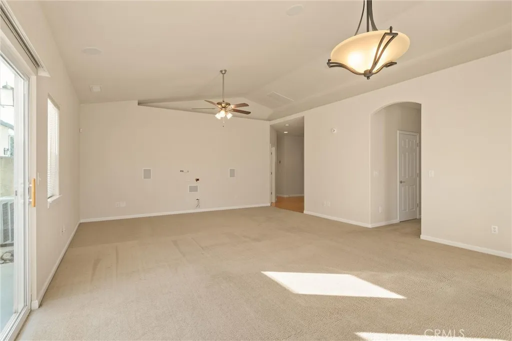 Inside, the split-bedroom floor plan provides privacy and flexibility for guests, family, or a home office. The spacious living room features vaulted ceilings and in-wall surround sound speakers, creating an open, inviting atmosphere. Vinyl flooring and carpeting add durability and comfort throughout, while the hall bathroom includes a tub/shower combination.