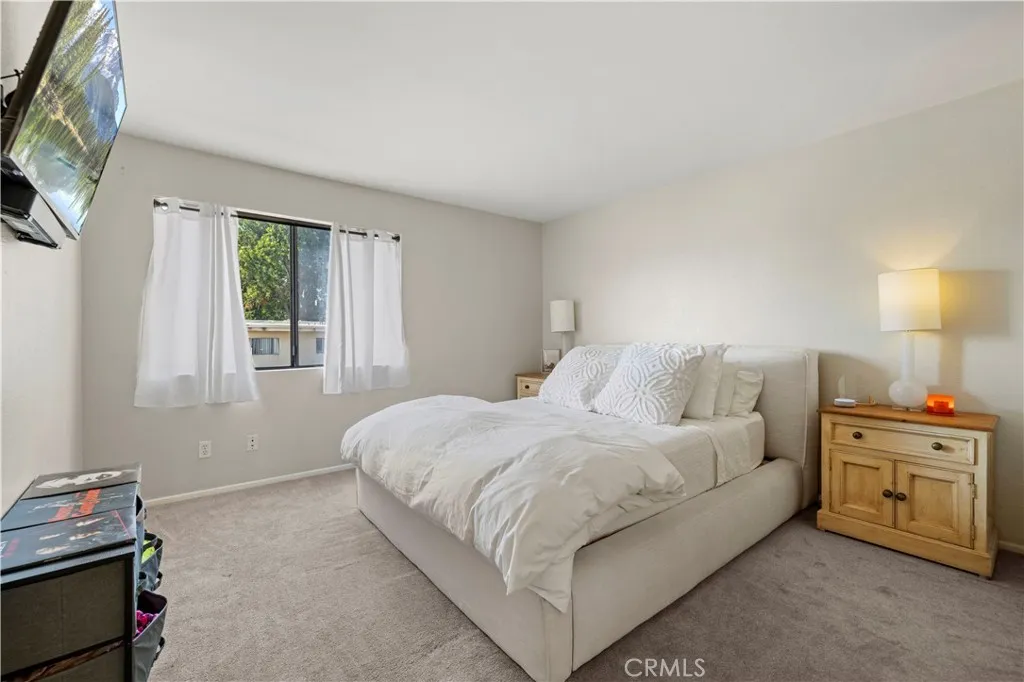 This home offers two generously sized bedrooms and one well-appointed bathroom. The primary bedroom includes a large picture window with honeycomb shades, dual closets—with mirrored wardrobe doors—and plush wall-to-wall carpeting. The second bedroom also features a large window, honeycomb shades, ample closet space with mirrored doors, and wall-to-wall carpeting.