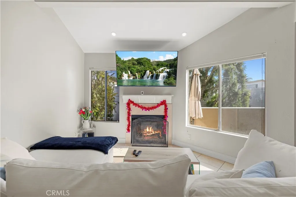 Step inside to a bright and open floor plan offering approximately 866 square feet of comfortable living space. The spacious living room is filled with natural light and features soaring beamed ceilings, recessed lighting, elegant tiled electric fireplace with mantel, and 18"X18" diagonally laid porcelain tile flooring throughout the main living areas.