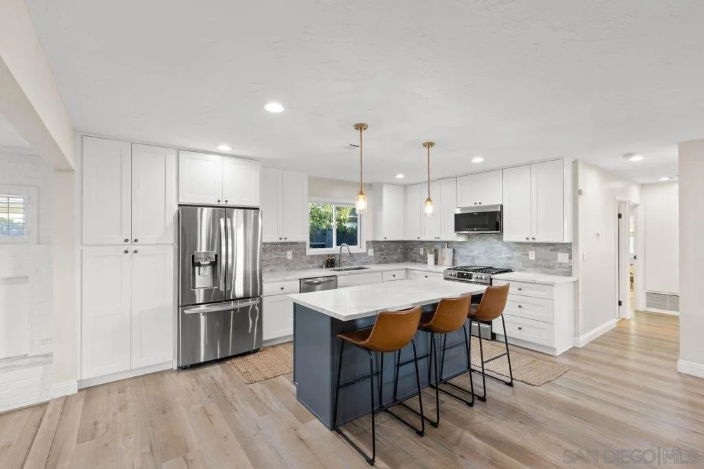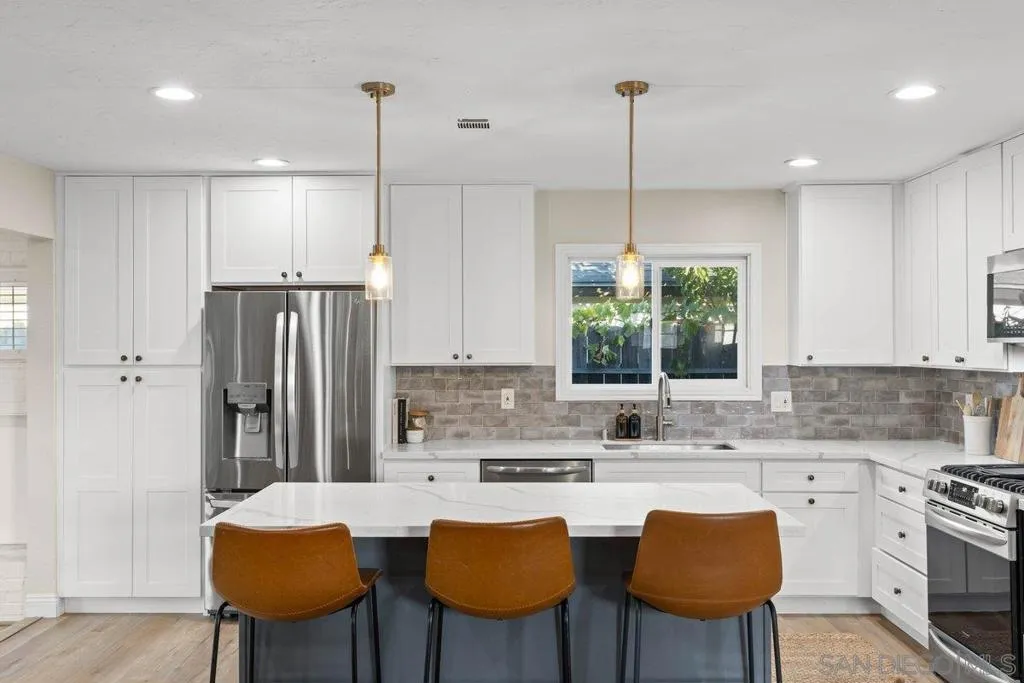 Stunning and rare home in the heart of the highly desirable Clairemont neighborhood, offering a flexible and spacious floor plan that is truly move in ready. The main level features an ensuite bedroom plus two additional bedrooms and a full bath, while the upper level boasts a massive primary suite with two walk in closets and a beautifully designed primary bathroom. The open concept layout showcases a gorgeous kitchen with a custom island, stainless steel appliances, gas cooking, modern lighting, and a striking tile backsplash, opening to a spacious living room with a cozy fireplace. All three bathrooms have been fully updated with custom finishes. Additional highlights include updated windows, excellent closet and storage space, a two car garage, and great curb appeal with easy care turf in both the front and backyard. The very private backyard is ideal for entertaining with a large covered patio and ample outdoor lighting for year round enjoyment. Conveniently located just minutes from parks, schools, restaurants, shopping, and beaches, this home offers the very best of San Diego living in a wonderful neighborhood. Stunning and rare home in the heart of the highly desirable Clairemont neighborhood, offering a flexible and spacious floor plan that is truly move in ready. The main level features an ensuite bedroom plus two additional bedrooms and a full bath, while the upper level boasts a massive primary suite with two walk in closets and a beautifully designed primary bathroom. The open concept layout showcases a gorgeous kitchen with a custom island, stainless steel appliances, gas cooking, modern lighting, and a striking tile backsplash, opening to a spacious living room with a cozy fireplace. All three bathrooms have been fully updated with custom finishes. Additional highlights include updated windows, excellent closet and storage space, a two car garage, and great curb appeal with easy care turf in both the front and backyard. The very private backyard is ideal for entertaining with a large covered patio and ample outdoor lighting for year round enjoyment. Conveniently located just minutes from parks, schools, restaurants, shopping, and beaches, this home offers the very best of San Diego living in a wonderful neighborhood.