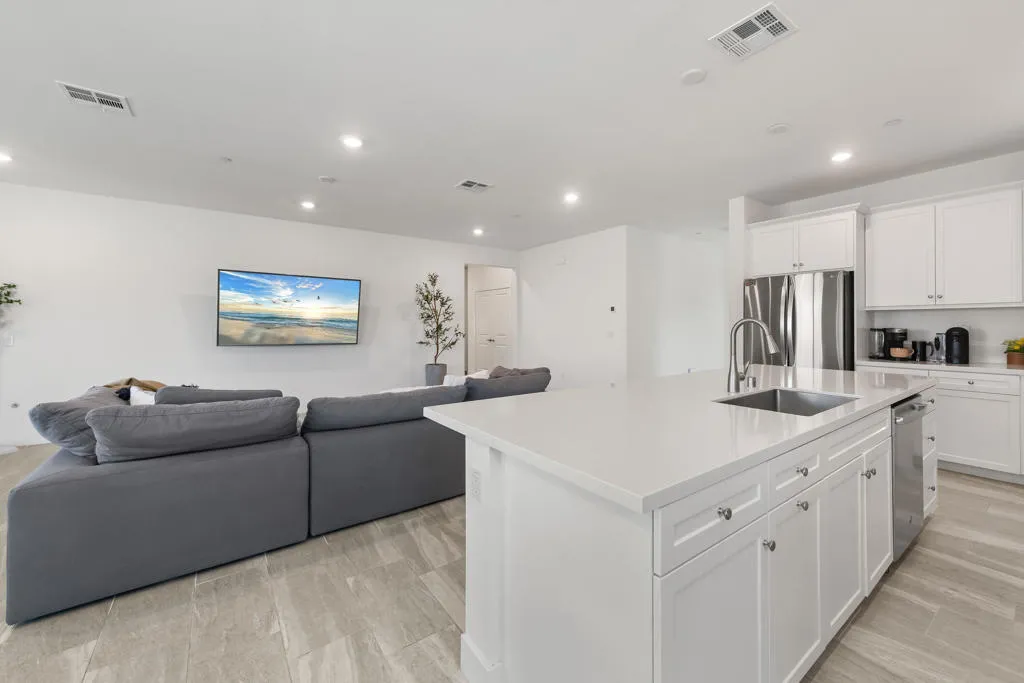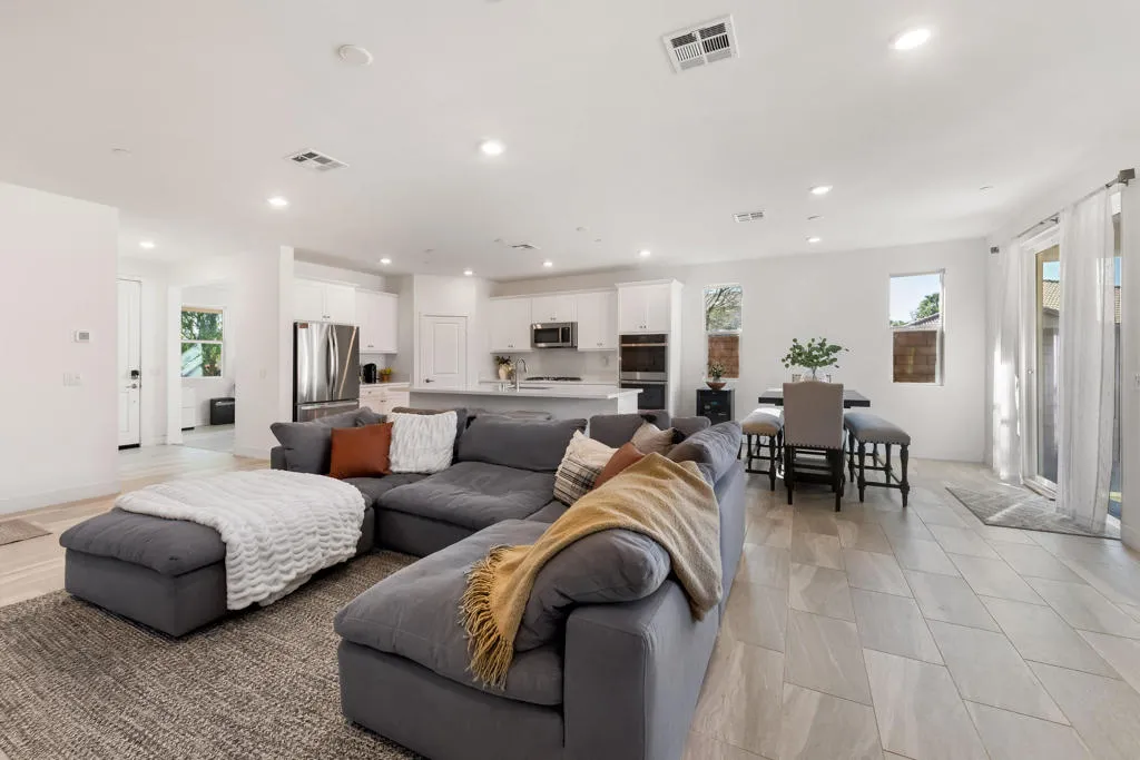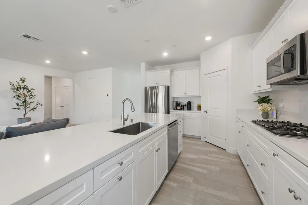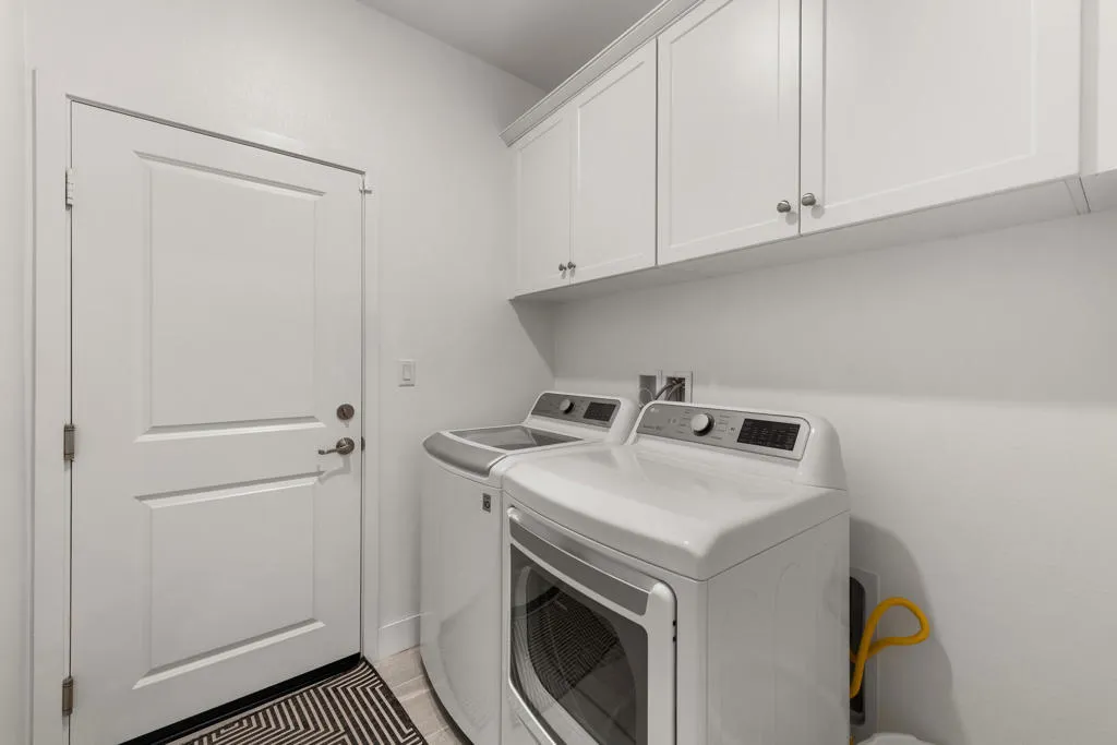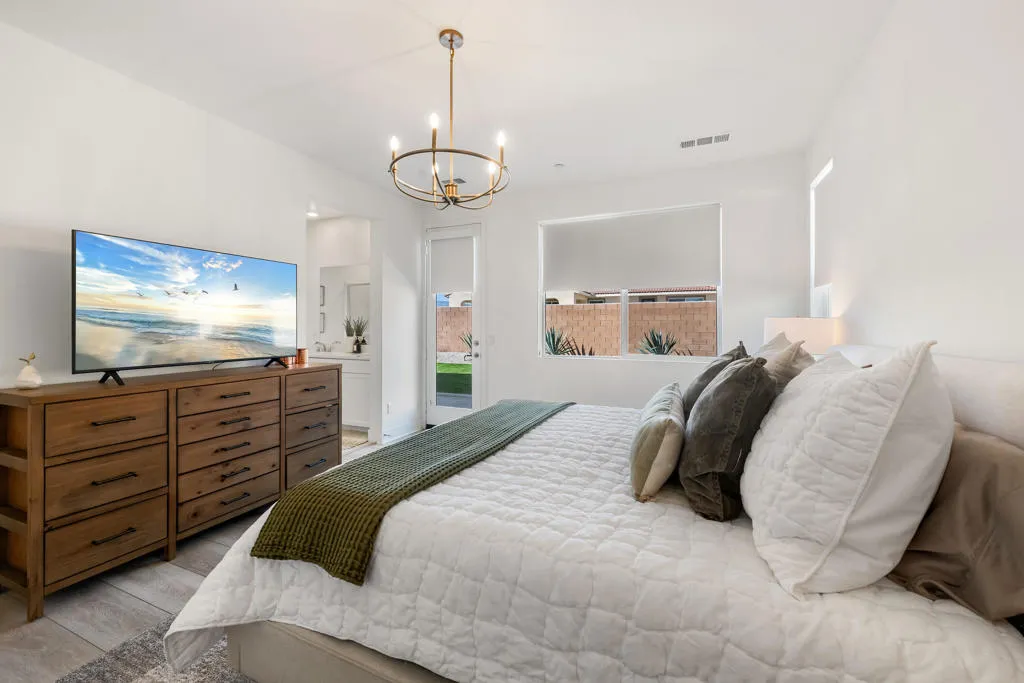 Located within the Paradiso gated community, this beautifully upgraded 2021 built 4-bedroom, 2-bath home offers effortless modern living with absolutely nothing left to do but move in! Designed with clean lines, quality finishes, and a thoughtful layout, the home feels fresh, current, and truly turn-key. At the heart of the home, the open-concept kitchen and family room create a bright, welcoming space ideal for entertaining or unwinding at the end of the day. The expansive kitchen is both stylish and functional, featuring GE stainless steel appliances with double ovens, a gourmet quartz island, and a spacious walk-in pantry, perfectly suited for daily living and hosting alike. The primary suite is a peaceful retreat, highlighted by a spa-inspired bathroom with a Moen glass-enclosed shower, luxurious soaking tub, and a large walk-in closet with custom single and double hanging rods for exceptional organization. Secondary bedrooms are versatile and well-proportioned, complemented by a sleek secondary bathroom with Moen fixtures and a tub/shower combination. A dedicated office provides the ideal space for working from home, studying, or creative pursuits. The private backyard offers a serene setting with a paved patio for lounging or dining, an open grass area, mature agaves, and surrounding desert landscaping is thoughtfully designed for low maintenance and everyday enjoyment.Additional highlights include a 3-car garage, a laundry room with built-in storage and washer and dryer included. Smart Home inclusions are Ring Doorbell Pro security and cameras, MyQ garage door, energy-efficient features such as LED lighting throughout, a tankless water heater, and water-conserving low-flow toilets and faucets with smart water shut off through MOEN's App, and Rainbird App to control landscaping sprinkler system. With paid-in-full solar panels, this home benefits from significantly reduced electricity costs, especially valuable during high-use summer months in the desert. A home this pristine is a rare find; schedule your private showing today to experience perfection before someone else makes it their new beginning.
