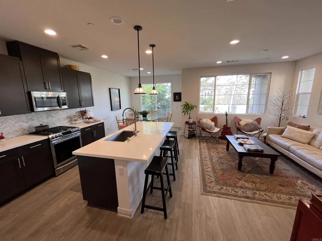 Beautiful end-unit townhome with unobstructed preserve views in the highly desirable Agave at The Preserve community in Carlsbad. This bright and private 3BR/2.5BA two-story home features an open floor plan, abundant natural light, and a rare setting backing directly to preserved open space. The interior showcases 9' ceilings, quartz slab countertops, composite flooring, plantation shutters upstairs, and a modern gourmet kitchen with European-style gray cabinetry, Samsung stainless appliances, recessed LED lighting, and sleek finishes throughout. The spacious primary suite includes a walk-in closet, dual sinks, cultured marble counters, and Andersen French doors opening to a private terrace. Enjoy seamless indoor-outdoor living with a custom poured-concrete patio and low-maintenance yard featuring a fruiting Meyer lemon tree, all overlooking protected open space and nearby trails. The attached 2-car garage includes insulated doors and LiftMaster opener. The home is designed for modern, energy-efficient living with fiber-optic readiness, network/data wiring, Low-E dual-glazed windows, tankless water heater, Energy Star appliances, and programmable thermostat. Residents of The Preserve enjoy resort-style amenities including pool, spa, fitness center, parks, playgrounds, barbecue areas, and extensive trail connections. Flexible purchase options available. The property also offers a rare 3% assumable mortgage (approx. $520K balance with ~22 years remaining), providing a meaningful affordability advantage compared with current market rates. Buyers may also pursue conventional financing. Prime location with convenient access to Hwy 78, I-5, Quarry Creek shopping and dining, Carlsbad Village, and some of Southern California’s best beaches, plus top-rated Carlsbad Unified schools including Hope Elementary, Calavera Hills Middle, and Sage Creek High. Contact listing agent for details on purchase options and loan assumption eligibility.