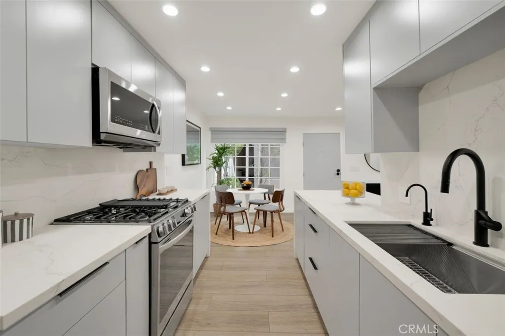 Welcome home! This beautifully reimagined townhouse-style condo in the heart of Sherman Oaks could be yours! This exceptional 2-bedroom, 2.5-bath end unit offers the rare luxury of no neighbors above or below, providing the privacy and quiet feel of single-family living. This unit was fully renovated in 2022. The renovations were thoughtful, high-end upgrades including soundproof drywall, soft-close cabinetry, stainless steel appliances, a built-in wine cooler, and designer finishes throughout. The light-filled living room features an elegant decorative fireplace, custom built-in bar, and convenient powder room downstairs. Flowing effortlessly into the dining area and sleek updated kitchen complete with quartz countertops and modern detailing. Upstairs, two spacious primary suites each offer their own en-suite bath and custom-designed closets, creating ideal comfort and privacy. The top level includes a dedicated laundry area with washer and dryer hookups. There is also access to your own private rooftop deck! This is perfect for entertaining or enjoying serene treetop and mountain views. Additional highlights include two side-by-side parking spaces in a secured gated garage, central air and heat, ample storage, and a low HOA covering water, trash, insurance, and common area maintenance. Ideally located just minutes from Trader Joe’s, Gelson’s, the Sherman Oaks Galleria and easy access to the 101 and 405 freeways. This home offers the perfect blend of modern style, privacy, and prime location in one of the Valley’s most desirable communities. Schedule your private showing today.