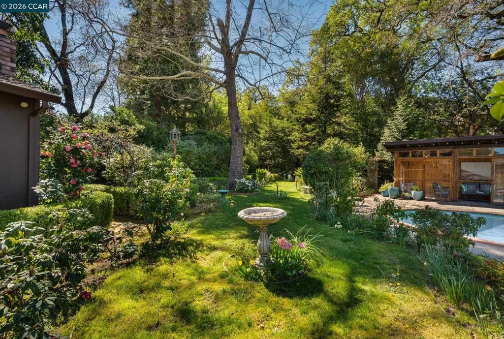 Step into a storybook setting with this enchanting English cottage, where timeless charm meets a garden-inspired lifestyle. Set on a flat .39-acre lot, the single-story home offers 3 bedrooms, 3 baths, and a dedicated office, wrapped in character-rich details including hardwood floors, stained glass accents, vaulted beamed ceilings, and sun-filled skylights. Outside, meandering paths lead through a breathtaking English garden, with a private well to keep the gardens lush, to a sparkling pool and a darling pool house with electricity and water—perfect as a creative retreat, guest space, or effortless entertaining hub.