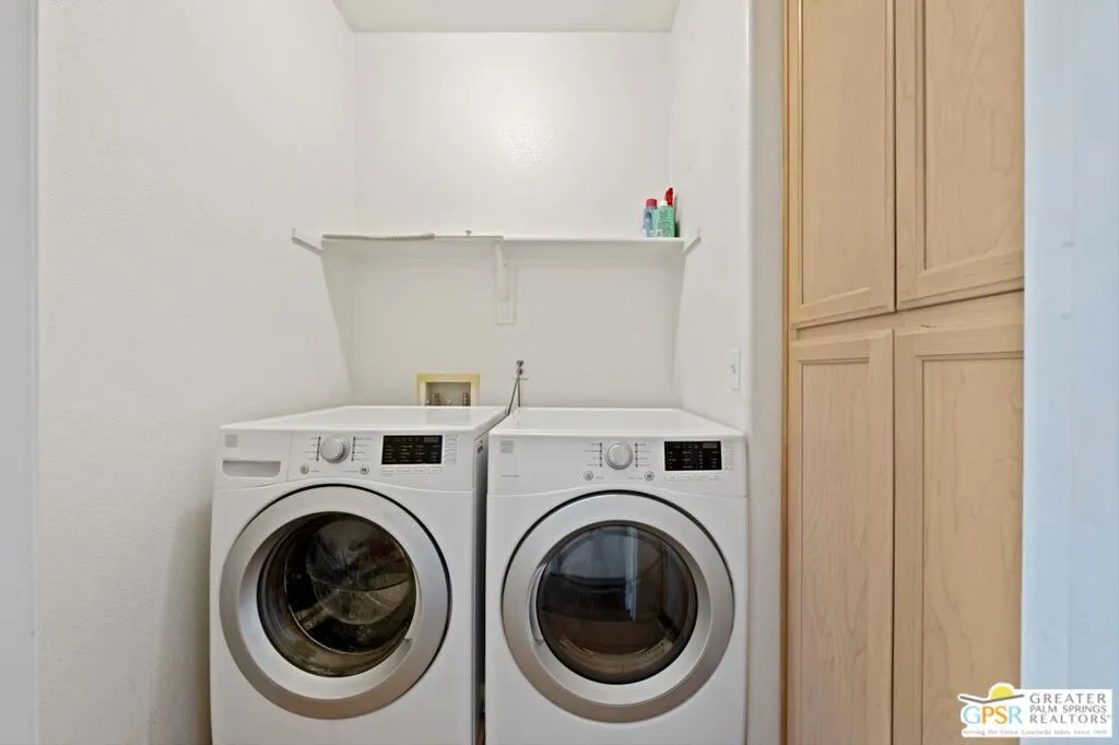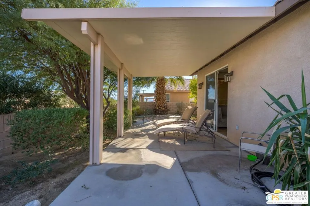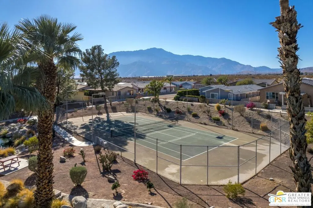This 2bed,2bath move-in rental (with PAID SOLAR - which means very very low electric bills) in gated community of Desert Willows. 55+ age restricted. All appliances included plus W/D units. Ceramic tile flooring in Kitchen and both Bathrooms. Laminate wood flooring in LR. Carpeting (brand new) in both bedrooms. Covered patio off the Kitchen/dining area---it's great for outdoor entertaining,,even has a gas line to hook upa BBQ Grill. Fantastic mountain views. Desert (low water usage) landscaping thoughtfully done. Desert Willow has amenities of clubhouse, pool & spa, exercise room, pickleball/tennis courts. There is also a community RV storage. Home comes with a 1 car garage and parking for 2nd car on driveway, if needed. Won't last long!!