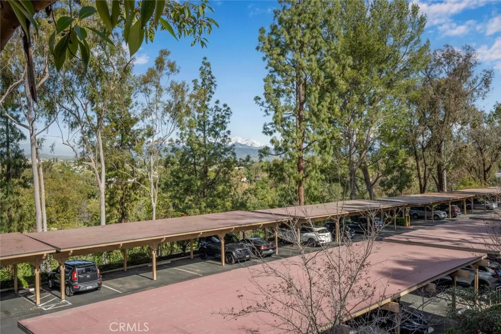 Upper level, one bedroom condo that feels like a tree house with a view of the mountains. Freshly painted in a neutral color with vinyl plank flooring throughout the home, installed 2 years ago. Living room is full of light from corner windows with east facing views and a sliding door out to the balcony. Open floorplan with living room, dining area and kitchen adjacent. Kitchen features painted cabinets, tile counters, pantry, range with hood and microwave. Spacious bedroom also has tree and mountain views with abundant closet space including built in shelves for linens. Full bathroom features updated vanity and fixtures. Mirrored doors in bedroom and mirrored wall in dining room add openness and light making the spaces feel bigger. Laundry hookups are in the unit off the dining room in a spacious closet with slatted, folding doors. Consider stackable laundry units to maximize all the available storage space. Central air and heat. Electrical panel has been upgraded. Community has 3 pools, a clubhouse, and 4 tennis courts. Retail services are available next door off of Grand Ave. Home has two assigned parking spaces, one covered and one partially covered just at the bottom of the steps, #580 and #615.