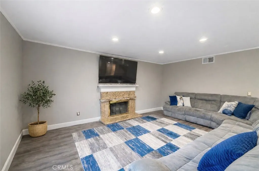 A welcoming double-door entry opens to bright, oversized living areas enhanced by recessed lighting, crown molding, and wide-plank wood-style flooring throughout. The formal living and dining areas flow seamlessly together, creating an ideal setting for gatherings and entertaining.