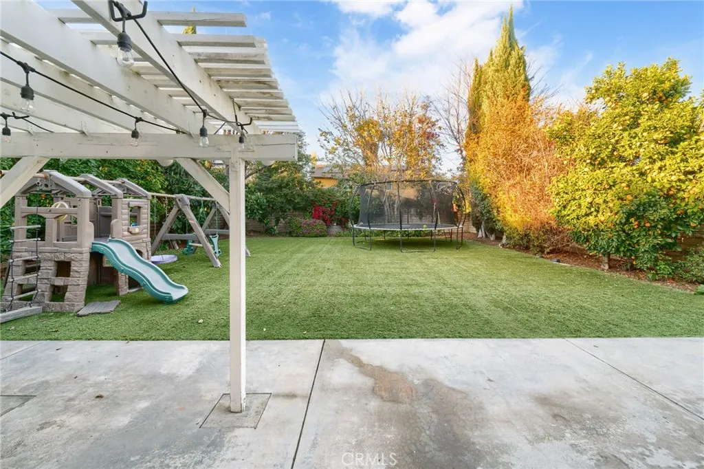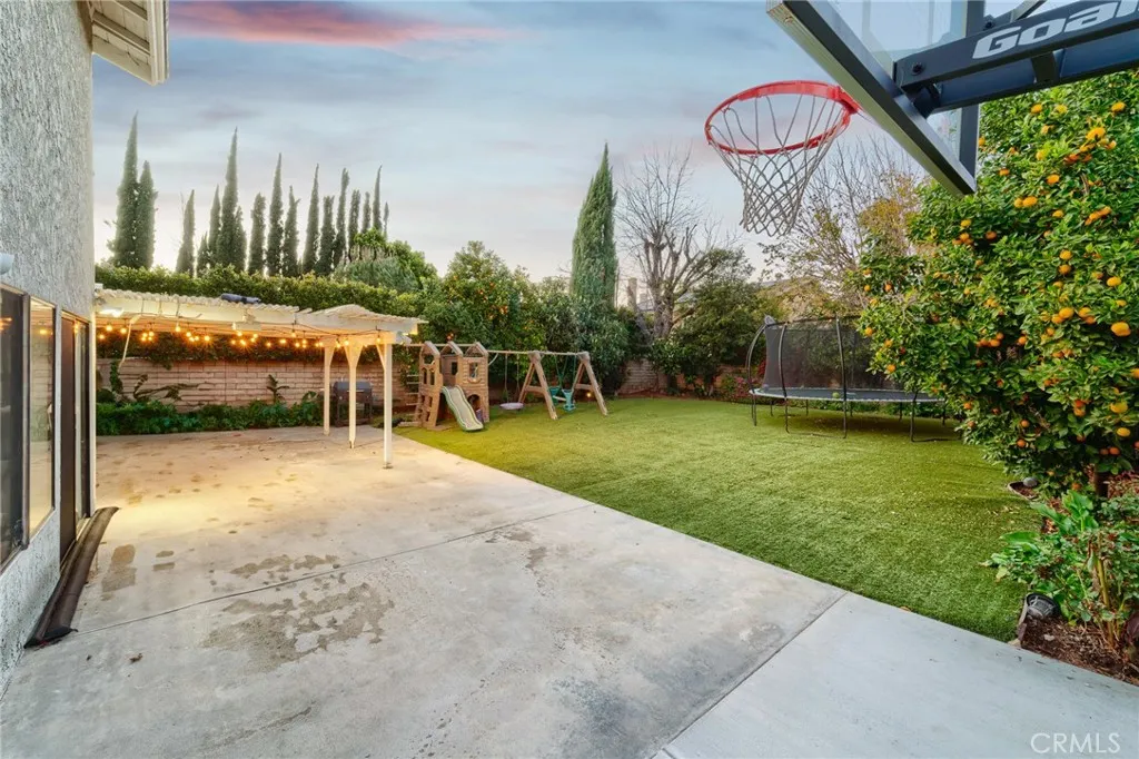 The backyard is designed for year-round enjoyment, featuring artificial turf, mature landscaping, a covered patio with string lighting, basketball hoop, and multiple areas for recreation and entertaining. Solar panels provide added efficiency and long-term savings.