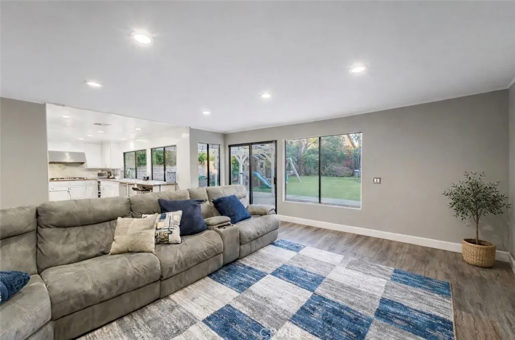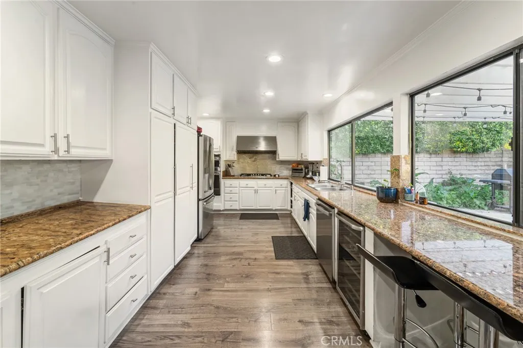 The spacious kitchen is appointed with granite countertops, abundant cabinetry, stainless steel appliances, and an extended counter with bar seating overlooking the backyard. Large picture windows fill the space with natural light and offer views of the outdoor entertaining areas.