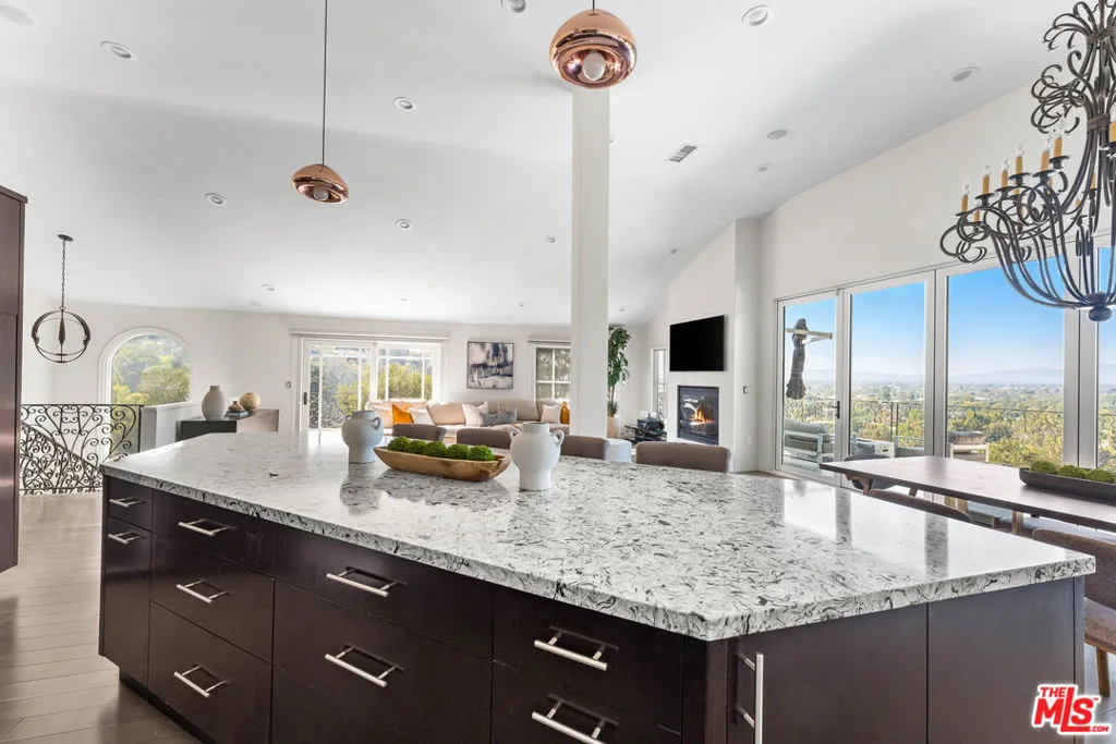 Perched in the tranquil hills of Studio City, this exceptional residence offers incredible privacy, bright, open living spaces, and stunning panoramic views. A dramatic entry leads you to a light-filled main level featuring an expansive open-concept living room, dining room, and kitchen, with soaring ceilings and walls of glass overlooking verdant vistas. The impeccably designed kitchen boasts Caesarstone countertops, stainless steel appliances, generous island seating, and ample cabinet space. Step through the adjoining dining room's glass bi-fold doors onto a sprawling terrace featuring a built-in fire pit and unobstructed valley and mountain views. This outdoor dining and lounge space is an idyllic setting for morning coffee and sunset gatherings. Downstairs you'll find the sumptuous primary bedroom, which features an abundance of windows, a fireplace, sliding glass doors that open to a balcony with tree-top views, a spa-inspired en-suite bathroom, and a huge custom walk-in closet. The primary suite also offers a private BBQ patio and an additional deck with a swim spa hot tub, creating a true resort-like experience at home. The home's lower level provides versatile living space with a spacious family room opening to its own balcony, a gym, a steam shower, and a bonus room. Additional features include a lushly landscaped terraced yard, a 2-car garage with direct access to the home, surround sound, a security system, and a water filtration system. This home feels like a secluded sanctuary, while perfectly located just moments away from countless incredible restaurants, shops, and markets on Ventura Blvd, and nearby Tujunga Village. Available furnished or unfurnished.