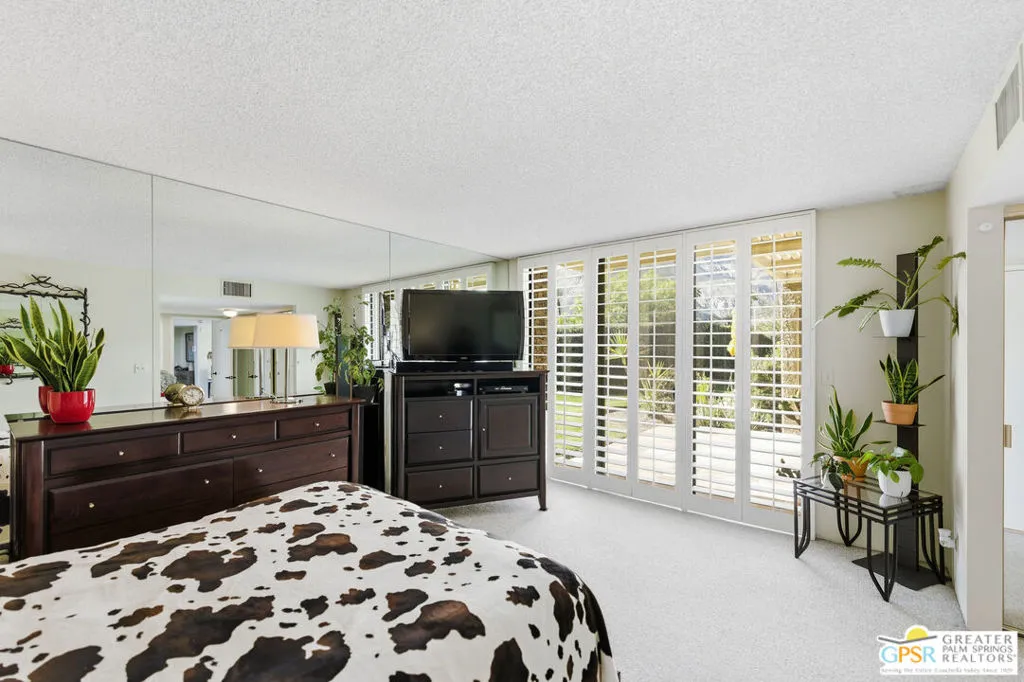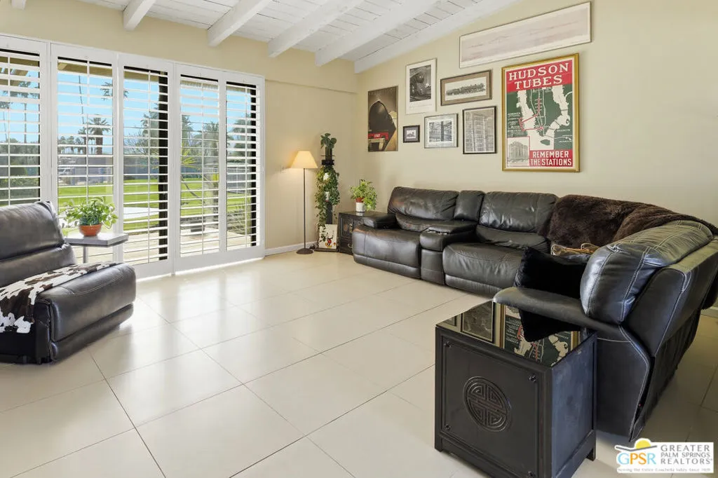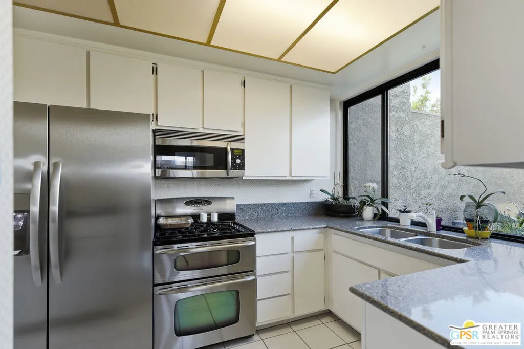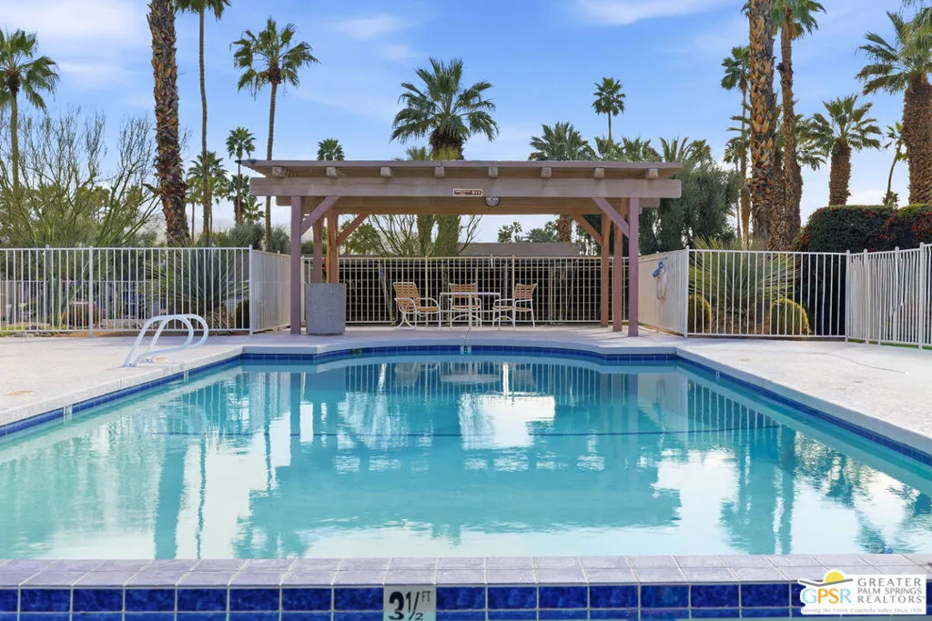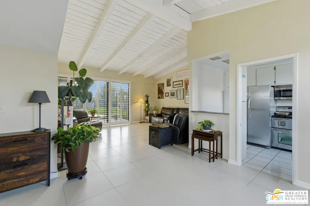 Discover this exceptional Central Palm Springs condominium, located on Fee Land that you own, within the highly sought-after Sunrise Oasis community. This spacious, single-level end unit offers 3 bedrooms and 2 bathrooms and is perfectly situated on the exterior of the community with desirable North/South orientation, along with some amazing west mountain views as well. This unit does not face another condo, and has a private, gated courtyard entrance welcoming you into an open, light-filled, and expansive living and dining area created by soaring wood-beamed ceilings, and large 24x24" neutral toned contemporary tile, which creates a sense of warmth and grandeur. There is newer duo pane MILGARD windows throughout the home. The living room is highlighted by expansive sliding doors that lead to a patio overlooking manicured green spaces, offering stunning mountain views and an excellent indoor-outdoor flow. A home perfect for those with a green thumb, and plantation shutters throughout for when you want it dark. The gourmet kitchen is well-appointed, overlooking the entrance courtyard, which bathes the kitchen in natural light, and equipped with stainless steel appliances along with ample counter space for all your culinary needs. The primary ensuite serves as a peaceful retreat, offering abundant natural light, generous closet space, private patio access, and breathtaking panoramic mountain views. The second bedroom, currently utilized as an office, is well lit and conveniently located between the two larger bedrooms. The third bedroom is spacious and bright, featuring ample closet space and patio access with glass sliders for gorgeous mountain views. The attached single-car garage offers laundry facilities, and there is dedicated parking for two additional vehicles just outside. There is also an upgraded electrical panel equipped with EV charging capability and is wired for solar. Sunrise Oasis is a low-density community of just 96 homes spread across 13 acres. Residents enjoy access to three pools, three spas, and tennis/pickleball courts, all surrounded by expansive green belts. The property is conveniently located minutes from Palm Springs premier dining, shopping, and vibrant nightlife.