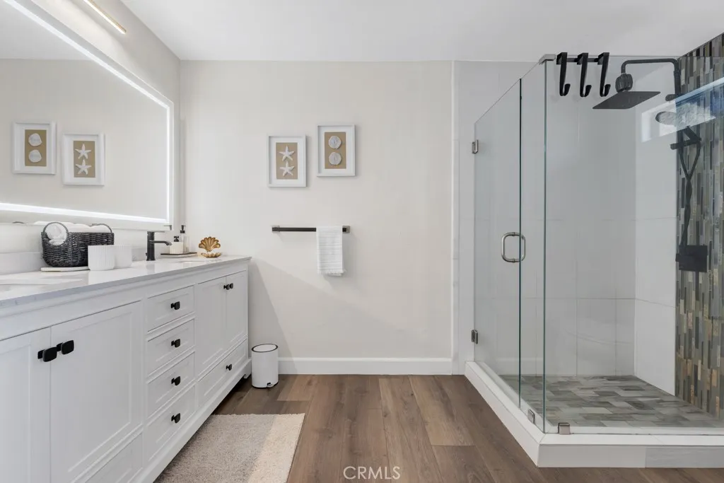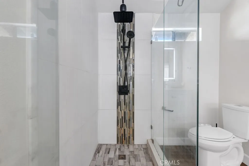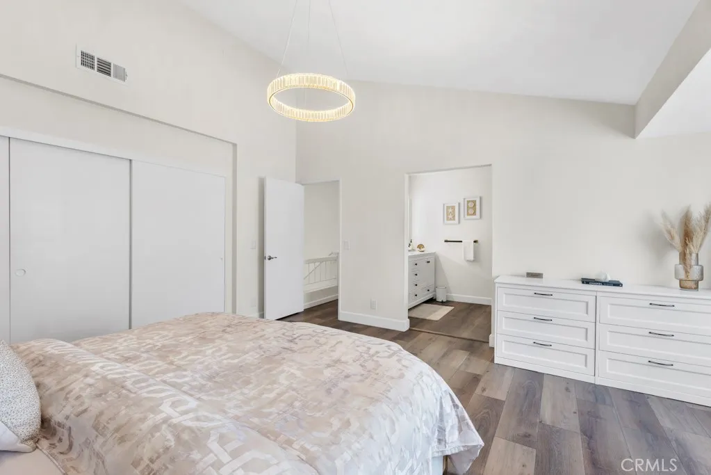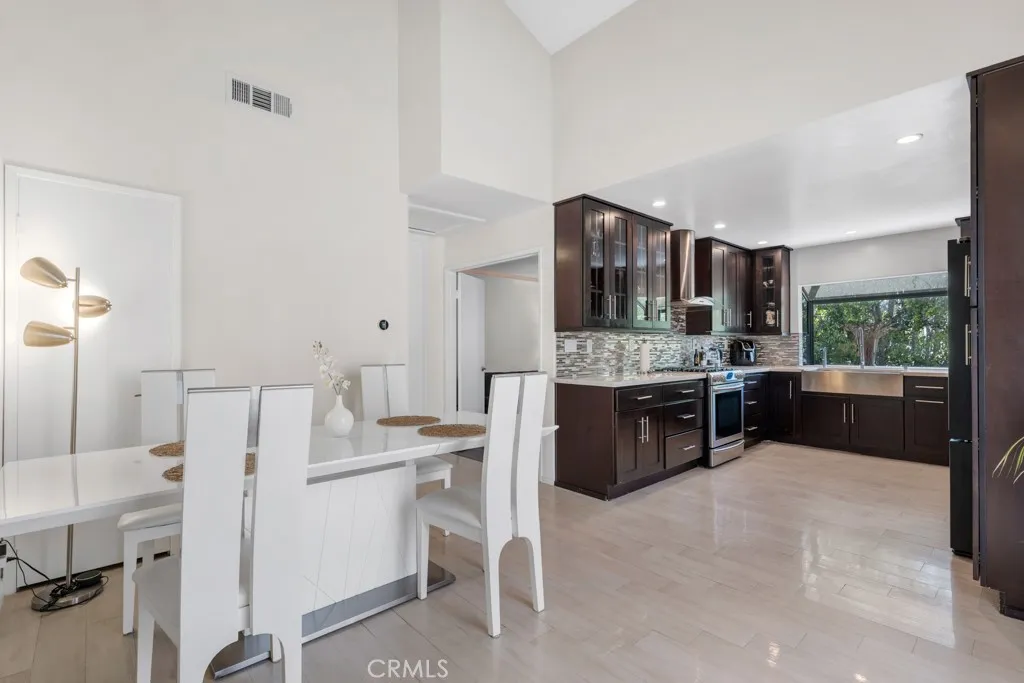Welcome to this desirable corner-unit townhome featuring vaulted ceilings in the well-maintained Topanga South Townhomes community in Chatsworth. With only one shared wall, this home offers added privacy and natural light. The interior features a spacious living room with recessed lighting, smooth ceilings, and laminate flooring throughout. A cozy fireplace with a custom tiled surround creates a warm focal point, while large sliding glass doors open to a private patio, ideal for relaxing or entertaining. The remodeled kitchen showcases dark wood cabinetry, quartz countertops, a mosaic tile backsplash, stainless steel appliances, and a farmhouse sink beneath a window. The adjacent dining area with vaulted ceilings enhances the open, airy layout and provides excellent flow for everyday living and gatherings. Upstairs, the primary suite offers vaulted ceilings, laminate flooring, and generous space. The remodeled en-suite bathroom features a dual-sink vanity, LED-lit mirror, modern fixtures, and a walk-in shower with a frameless glass enclosure and rainfall showerhead. The secondary bedroom is well-sized and versatile, and the updated hall bathroom includes a tub/shower combination with contemporary finishes. Additional highlights include a direct-access two-car garage with epoxy flooring and built-in storage cabinetry. The tree-lined community offers resort-style amenities, including a pool and spa, and is conveniently located near shopping, dining, hiking trails, major freeways, and the scenic Topanga Canyon area.