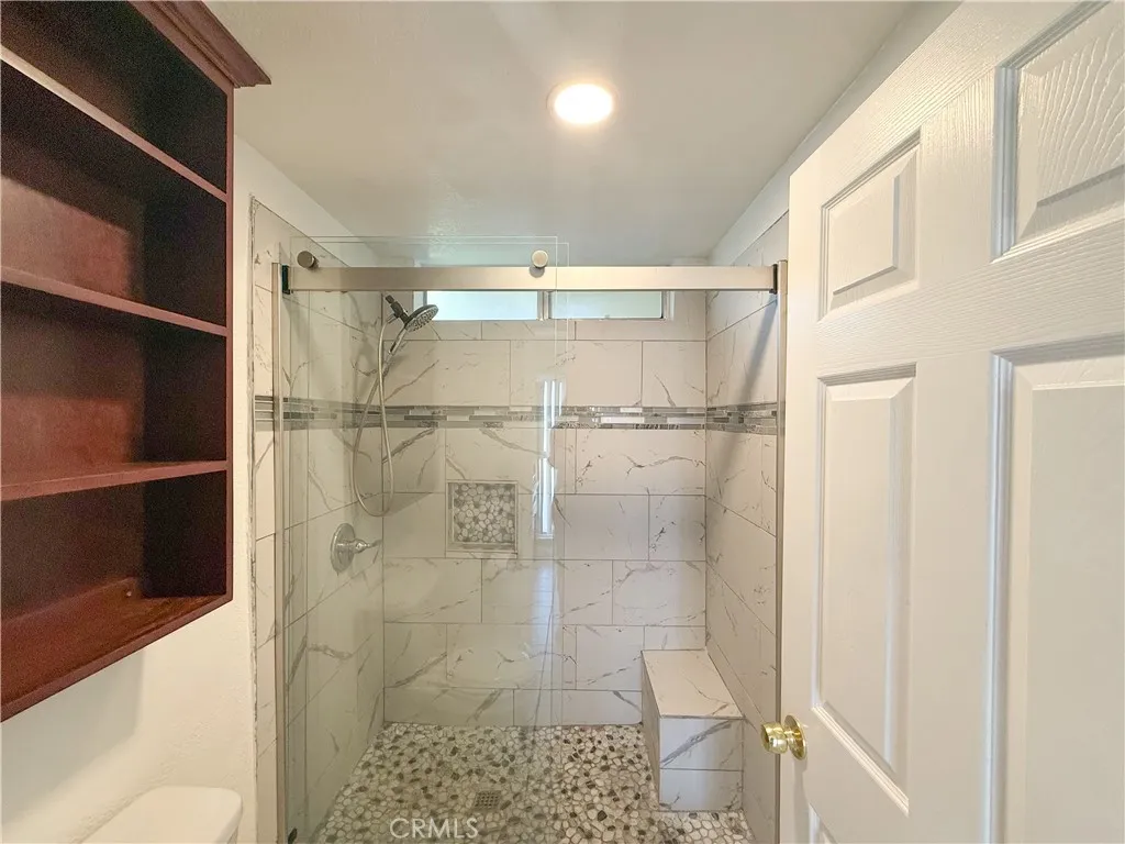 Situated on a corner lot surrounded by mature trees and lush greenery, this beautifully upgraded first-floor 1-bedroom, 1-bath residence offers stylish finishes, comfort, and the convenience of no steps. The spacious primary bedroom features tile flooring, track lighting, a large window with vertical blinds, and custom dark cherry wood vanity cabinetry. The fully remodeled bathroom showcases granite countertops, a striking glass vessel sink with stainless steel faucet, double light fixtures, large mirror with medicine cabinet, a convenient, custome cherry wood shelving wall unit. The shower is thoughtfully designed with glass sliding enclosure, pebble stone flooring, built-in bench, tiled surround with niche, and a removable shower-head. The remodeled kitchen features custom cherry wood cabinetry with stainless steel pulls, granite countertops and backsplash, recessed lighting above a large double stainless steel sink with pull-out spray nozzle, stainless steel stove, microwave, dishwasher, and generous counter space—all complemented by tile flooring throughout. The living room includes a wall A/C unit, large window with blinds, additional custom cabinetry with a large mirror, and sliding glass doors that lead to a fully enclosed private patio with storage. This home includes two dedicated parking spaces, with overhead storage in the carport area and access to community washer and dryer facilities. Not to mention it is conveniently located near Brio Park and the Children’s Museum at La Habra, offering upgraded living in a peaceful, tree-lined setting.