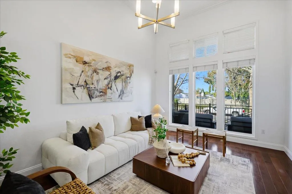 Beautifully upgraded Toll Brothers townhome in the heart of Sunnyvale. This 3 bedroom, 2.5 bath home features soaring 13 foot ceilings, abundant natural light, and an elegant European chandelier. The open mid level offers a spacious family room, dining area, and kitchen with stainless steel appliances, gas stove, breakfast bar, and ample cabinetry. A private patio and powder room complete the main living area. Upstairs includes generously sized bedrooms and a primary suite with vaulted ceilings, walk in closet, and bath with dual sinks, soaking tub, and separate shower. Additional highlights include hardwood floors, recessed lighting, upstairs laundry, Nest controls, air conditioning, security system, and a two car garage with 240 volt EV charger outlet. Walking distance to Seven Seas Park with basketball courts, tennis courts, playground, and water park. Convenient access to Highways 237, 101, and 85, and close to major tech campuses including Apple, Google, Amazon, LinkedIn, and Meta.