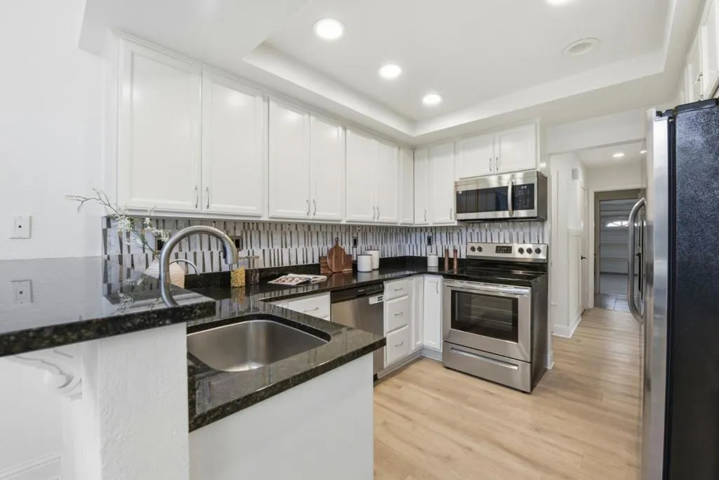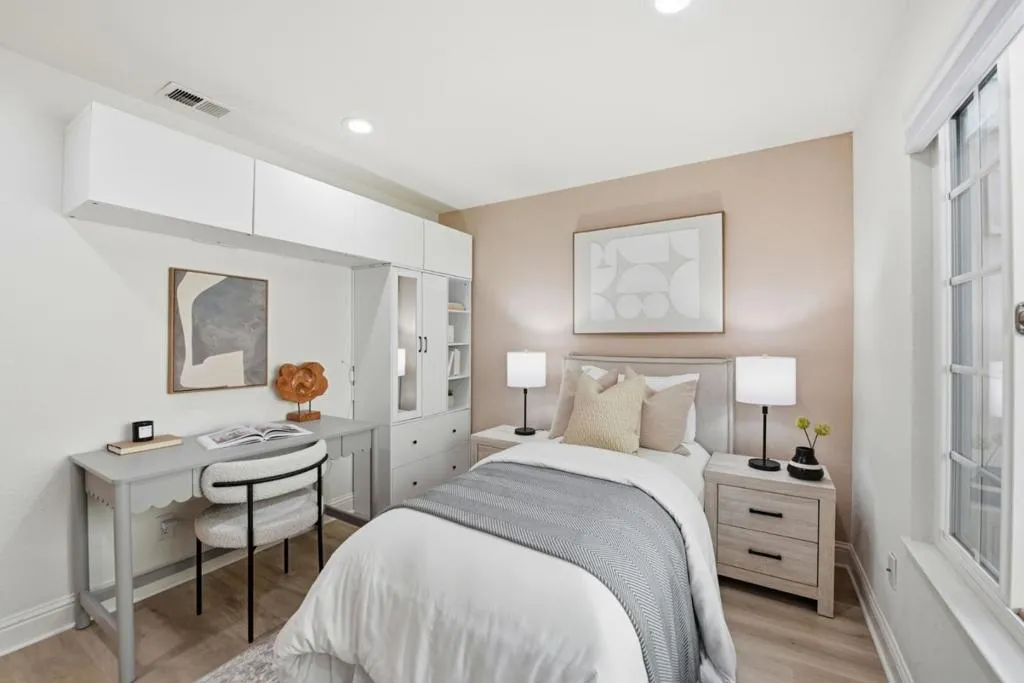 Welcome to 4822 La Habra St, a thoughtfully updated north-east facing single-story three bedroom, two bathroom residence tucked into a peaceful Union City neighborhood near a scenic creekside trail. Inside, the home offers a bright, open layout with high ceilings and abundant natural light, highlighted by dramatic gable windows framing views of the private backyard. Recessed lighting and updated flooring create a clean, modern aesthetic with exceptional privacy throughout. The spacious primary suite offers a private patio and a skylit bathroom. Guest bedrooms feature new blackout window treatments for added comfort and privacy. Outdoor living stands out with a designer backyard featuring a pergola, turf lawn, custom pavers, illuminated retaining wall, integrated electrical outlets, and refreshed landscaping (~$32K). The professionally reimagined front yard adds strong curb appeal with curated plantings and design enhancements (~$15K). Additional highlights include an epoxy-finished garage and a 240V EV charging outlet. Located in a quiet, friendly neighborhood near a scenic creek ideal for walking or running, this home offers a refined blend of comfort, design, and lifestyle.