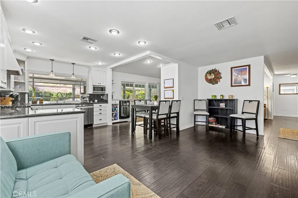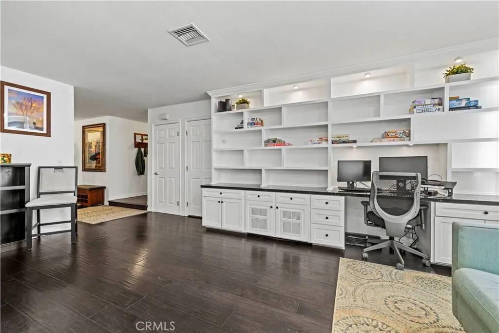 Inside, you’ll find wood flooring and an open layout that creates a comfortable flow between the kitchen and family room. Dual-pane windows and a whole-house fan enhance energy efficiency and everyday comfort. The kitchen offers white cabinetry, granite countertops, stainless steel appliances, recessed lighting, and added built-ins in the office area for extra storage and functionality. It opens directly to the living spaces, making it practical for daily living and gatherings alike.