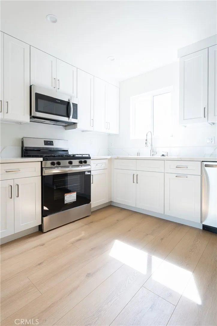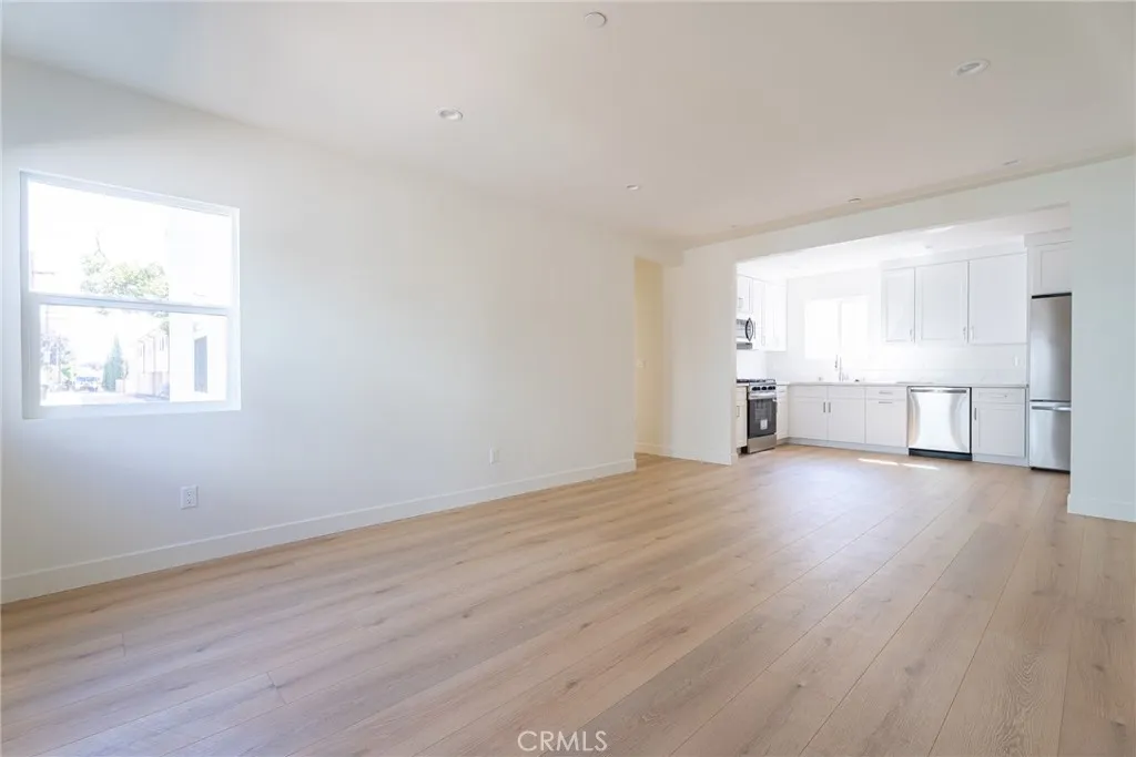 Welcome to this beautifully fully renovated 2 bed, 1 bath apartment at 1065 E Sazier Ave, Unit 101, located just minutes from downtown Burbank. This first-floor unit provides a spacious modern living with large windows and abundant natural light. The open-concept living and kitchen area features laminate flooring and a brand-new kitchen with white shaker cabinets, quartz countertops, and stainless steel appliances, including a gas stove, refrigerator, dishwasher, and microwave. Enjoy the convenience of an in-unit stackable washer and dryer and split-unit HVAC with three zones for customized comfort. The spacious bathroom is beautifully finished with large-format tile, a modern vanity with quartz counter, and a walk-in shower. Both bedrooms offer generous closet space. This unit has been completely gutted and rebuilt, including new windows, roof, stucco, electrical, plumbing, HVAC, and all interior finishes. Limited-time move-in special: $1,000 credit applied to first month’s rent for qualified applicants until March 3.
