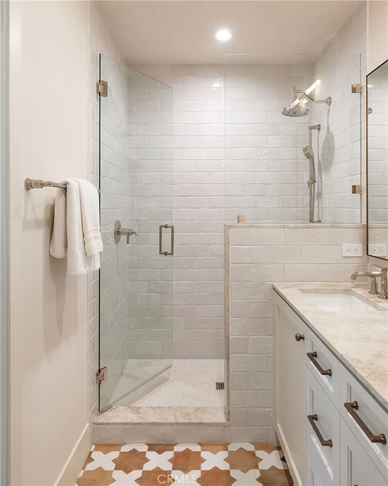 The primary suite offers a peaceful retreat, and the spa-inspired bath showcases premium custom cabinetry, designer tile work, and refined stone surfaces throughout. A spacious new walk-in shower and a thoughtfully added linen closet enhance both comfort and functionality. The secondary bath continues the same elevated craftsmanship with cohesive tile and stone detailing.