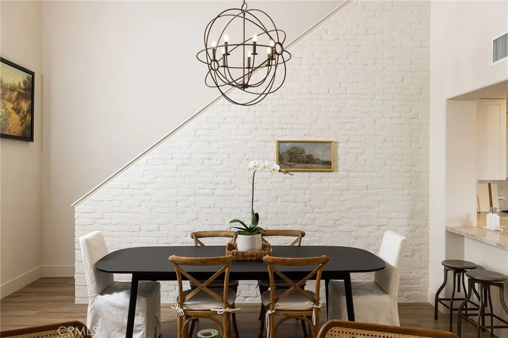 The living room feels both dramatic and inviting, anchored by a white painted brick feature wall that adds warmth and texture. Wide-plank flooring grounds the space, while thoughtfully layered lighting creates a soft, welcoming glow. Just beyond, a private patio extends the living area outdoors — an ideal setting for morning coffee or quiet evenings under the open sky.