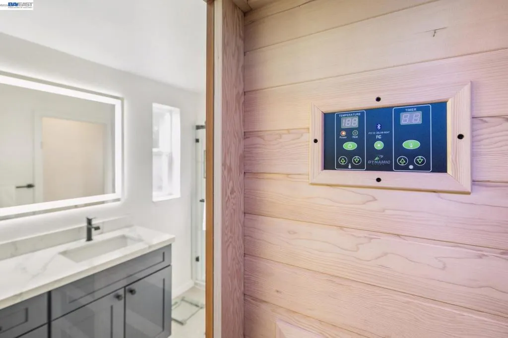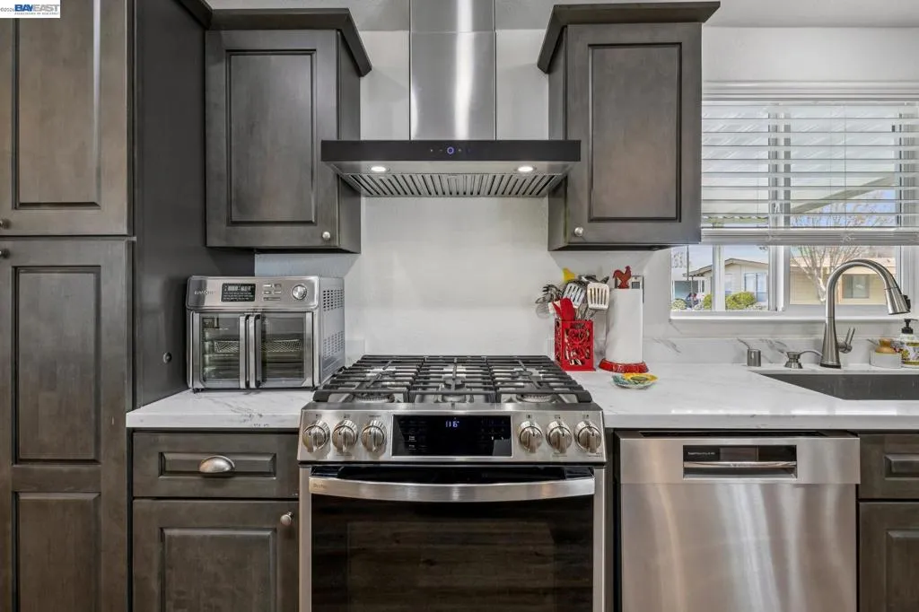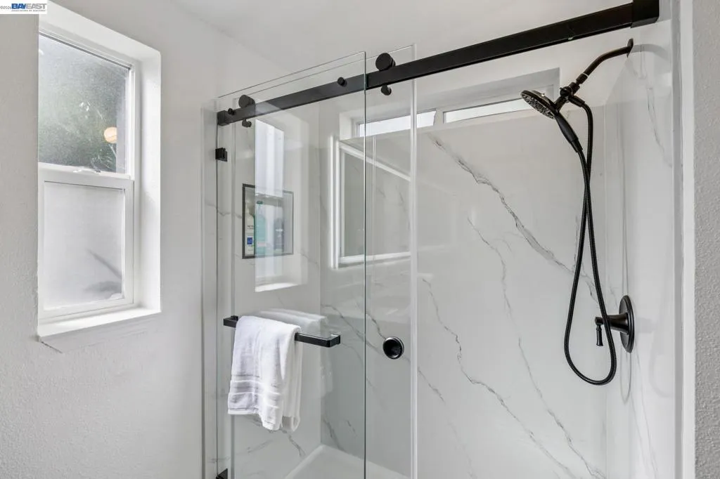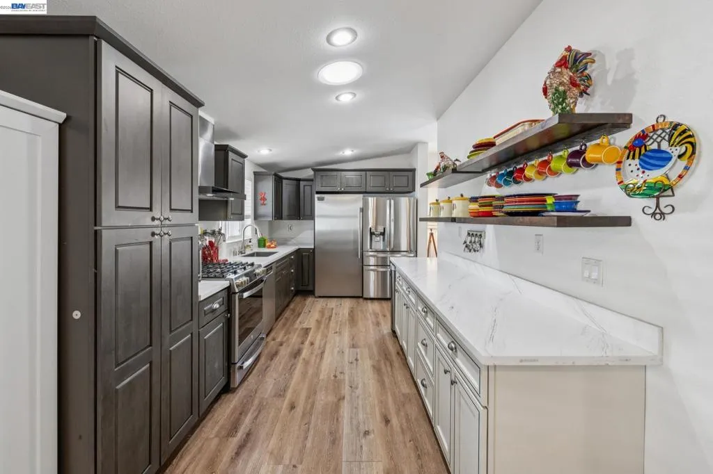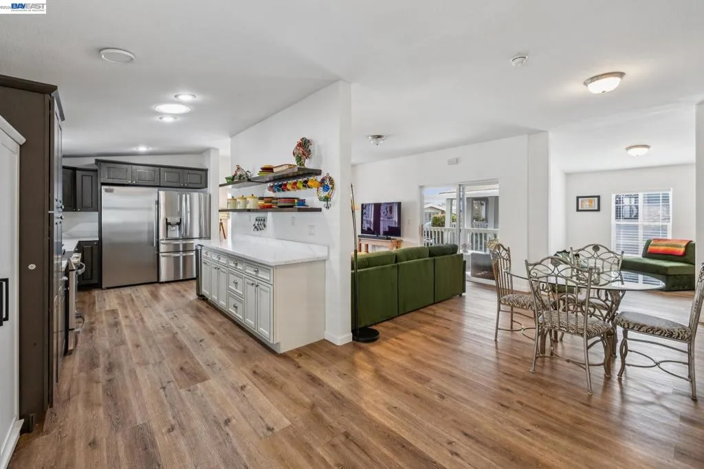 WOW! Absolutely move-in ready and fully remodeled, this spectacular 1,856 sq ft, 3-bedroom, 2-bath home looks and feels brand new. Tucked away in a quiet and highly sought-after 55+ New England Village community, this home offers a bright, open floor plan with a warm, inviting feel and exceptional quality throughout.Luxury features include an expansive kitchen with granite countertops, beautiful new cabinetry, stainless steel appliances, high ceilings, and crown molding. The oversized primary suite is a true retreat, featuring a spa-like bathroom with dual sinks, large stall shower, separate WC, and a private sauna. Both bathrooms have been fully renovated with refined finishes.Additional highlights include new windows, new flooring, a new roof, central air conditioning, indoor laundry with washer and dryer included, a detached storage shed, and paid 12-panel solar with battery backup for energy efficiency and peace of mind. A bonus area off the living room provides flexible space ideal for an office, guest area, or hobby room. Set within park-like grounds, New England Village offers a clubhouse and pool, with convenient access to I-880. Every detail is in stellar condition, offering the quality and feel of a modern custom home — simply unpack, relax, and enjoy for years to come. Fireplaces: NO