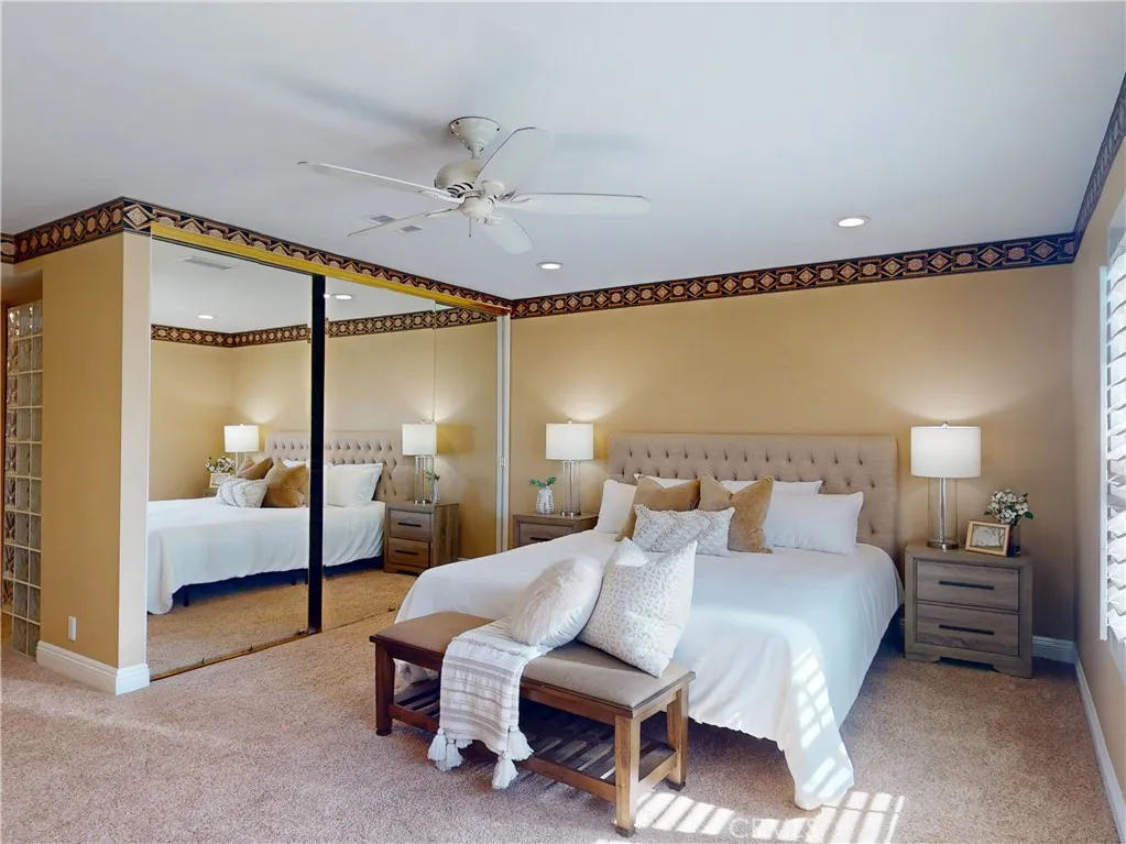 An amazing home with over 2,800 sq ft, with one bedroom downstairs, and one bathroom downstairs. So many wonderful features to enjoy including a Living Room with vaulted ceilings and a newly remodeled Fireplace, with a formal Dining Room Adjacent. There is another large eating area in the remodeled Kitchen perfect for large Holiday gatherings. Next to the Kitchen you will find a very impressive, and very large Family Room. Need a LARGE Primary Bedroom? We have got it. Tons of room, with 2 mirrored closets, and a gorgeous ensuite full bath, There are 2 more extremely large bedrooms plus another remodeled bath upstairs. We also have Central Air with 3 zones, inside laundry, Custom shutters on every window, dual pane windows and slider, smooth ceilings, 6 panel doors, a Tile roof, newly painted exterior, recently painted interior, and so much more. There is a large storage shed in the backyard, which you can use for a playhouse!! Green Valley features 3 pools 2 clubhouses, 21 acres of private park and 2 In-tract award winning Fountain Valley Schools