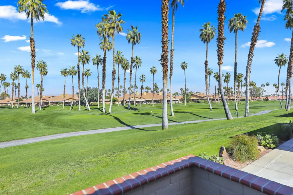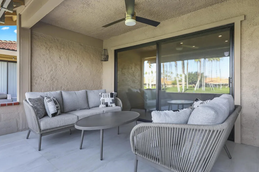 Completely REIMAGINED and REMODELED to modern Scandinavian-inspired elegance, this north-facing end-unit El Grande floor plan delivers the kind of calm, light-filled living that immediately makes you exhale. Clean lines, soft neutral tones, and abundant natural light create a serene, sophisticated ambiance from the moment you enter. Walls of windows frame uninterrupted views straight down the center of the lush fairway, across a sparkling lake with fountain, and toward the dramatic Chocolate Mountains beyond. The indoor-outdoor connection is exceptional. The expanded open-concept layout features vaulted ceilings, custom tile flooring throughout, and energy-efficient dual-pane windows. A dramatic floor-to-ceiling two-sided fireplace anchors both the living space and the expanded third bedroom/game room, enhancing warmth and architectural interest. The redesigned kitchen is both beautiful and functional, offering Quartz countertops, a generous breakfast bar with seating for four, stainless steel appliances, and a separate wet bar with wine refrigerator and floating shelves--ideal for entertaining. The primary suite is a private retreat with a walk-in closet and a spa-inspired bath featuring dual vanities, a freestanding soaking tub, and an oversized tiled shower. The guest bedroom enjoys direct access to a hall bath, while the expanded third bedroom functions beautifully as a den, game room, or additional suite, complete with vaulted ceilings, skylights, fireplace, and its own full bath with a large tiled shower. Additional highlights include a new roof, new west-facing Milgard dual-pane windows, new screens on the sliding glass doors, recessed lighting throughout, and direct access to an oversized garage with abundant built-in storage through the laundry room with added cabinetry. The tiled patio features an automatic retractable awning, modern ceiling fan, and convenient side-yard access gate. Located within Chaparral Country Club in the heart of Palm Desert, residents enjoy an 18-hole golf course, 21 pools and spas, tennis, pickleball, fitness center, activity center, and a beautifully remodeled clubhouse with dining and social events. HOA dues include basic cable and internet, trash, landscape maintenance, exterior maintenance, and roof coverage. This home offers an exceptional blend of architectural presence, calming design, and premier golf course positioning.