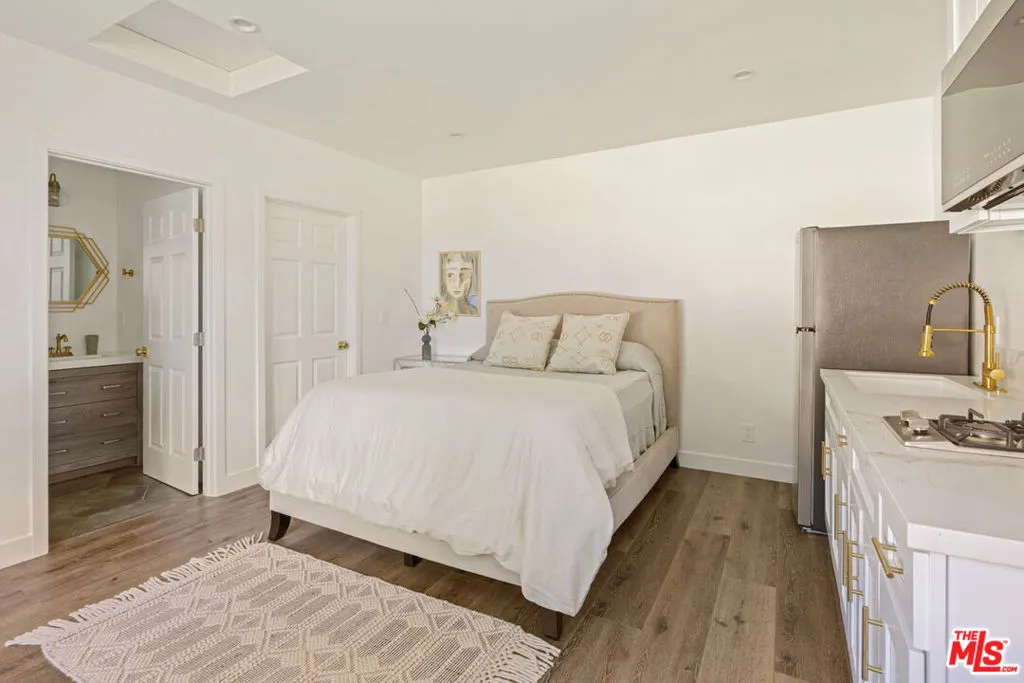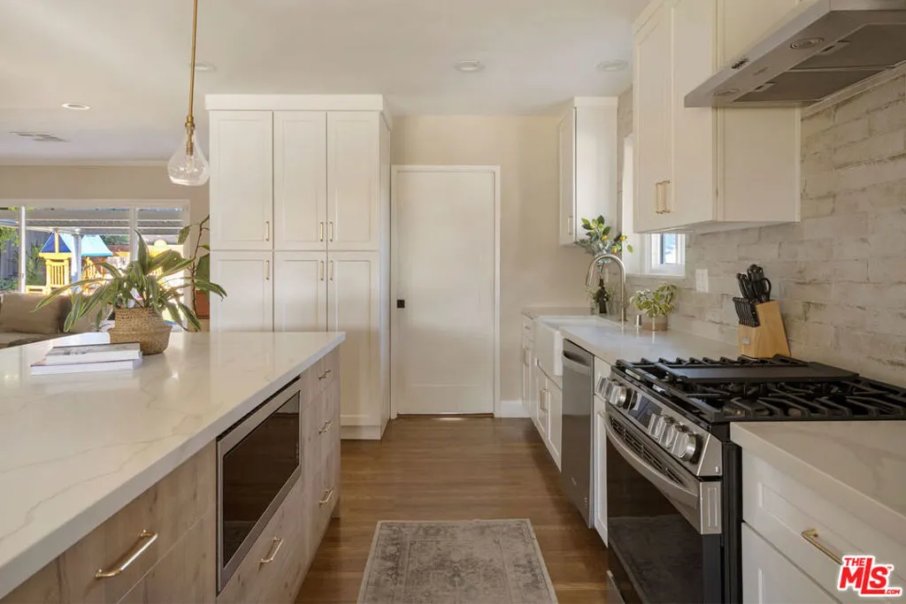 Settle in scenic Valley Village with this beautifully updated Traditional featuring a modern ADU, spacious yard and motivated seller. Built in 1952, the home radiates serene mid-century vibes with an open floor plan anchored by a double-sided fireplace; wood floors run throughout and large windows bring in the natural light. The renovated kitchen makes meal prep easy with stone countertops, breakfast island, generous storage, and stainless appliances. Two spacious bedrooms include one with French doors opening to the yard; the remodeled bath has a soaking tub and separate shower, and there is a powder room for guests. Step out to the generous backyard, a grassy expanse for lounging, play, outdoor dining, and anything you envision. The detached one-bedroom ADU with a kitchen and bath is ideal for guests, work space, or rental income. Amenities include central AC, laundry, updated systems, and ample off-street parking. The tranquil setting puts you within the highly rated Sendak Elementary boundary, and just a short distance from local shops, restaurants, NoHo West, with easy freeway access.